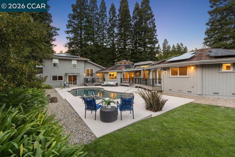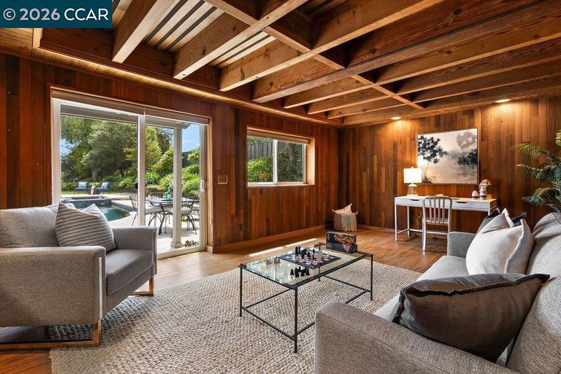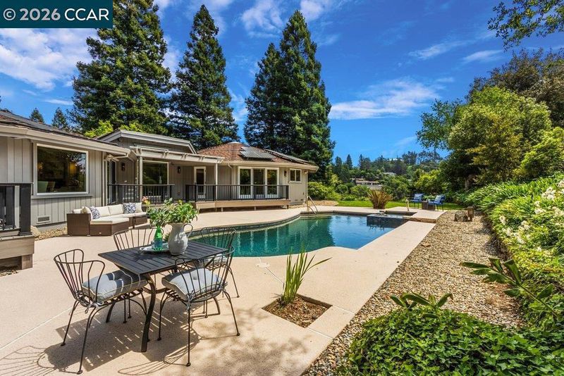 A stunning architecturally designed contemporary with two additional rooms, not included in the bedroom count for office space, including one thoughtfully detached from the main living area, offering flexibility and privacy for work or creative pursuits. Tired of Orinda ranchers? This sophisticated, immaculate home stands apart. Completely remodeled, it showcases soaring, detailed ceilings and a design that beautifully accentuates both the natural surroundings and the interior spaces. At the heart of the home, a spacious great room unfolds into a chef’s kitchen equipped for both effortless daily living and memorable entertaining. The gracious primary suite offers a serene retreat, enhancing a relaxed and comfortable lifestyle. The home is centered around a beautiful pool area, embraced by mature landscaping that creates a private, tranquil setting. The property also features a level lawn area, multiple decks, and an expansive vegetable garden; partially fenced and ready to be planted. Designed with both sustainability and safety in mind, the home includes solar heating for the pool, electrical solar, and two Tesla battery packs. The landscaping has been carefully planned to be fire safe. Ideally located in the sought-after Glorietta area near Tahos Road, this home offers a great commute while maintaining a quiet, peaceful atmosphere both inside and out. This lovely Orinda home is truly move-in ready. Just arrive and enjoy. Open Saturday and Sunday 5/2 & 5/3 from 1–4 PM.