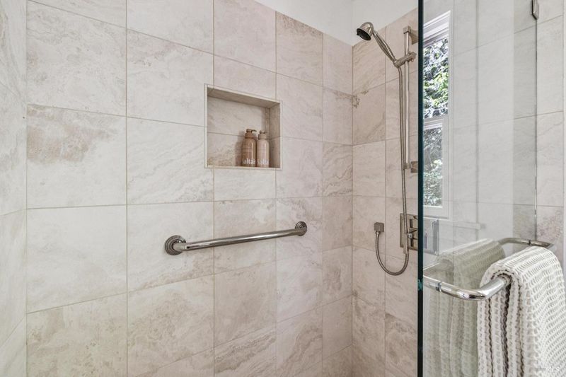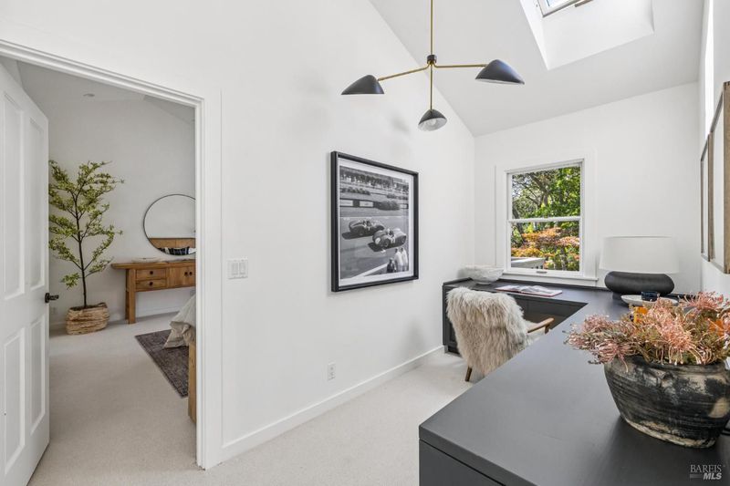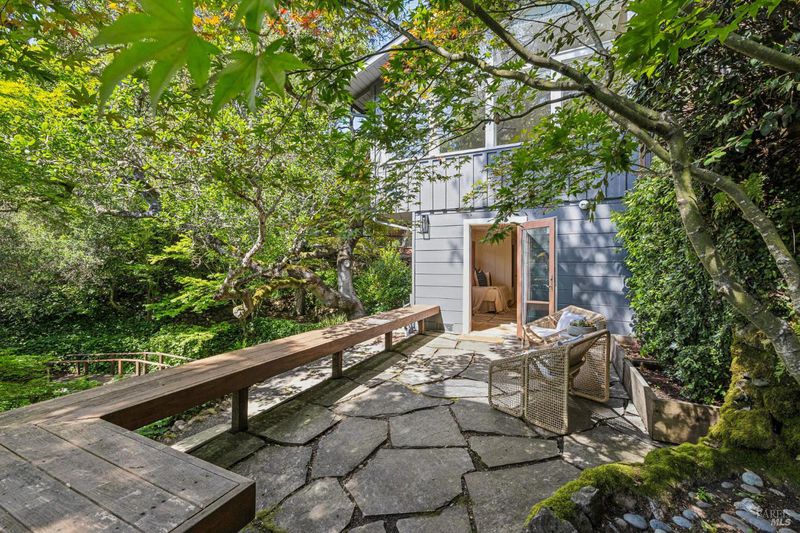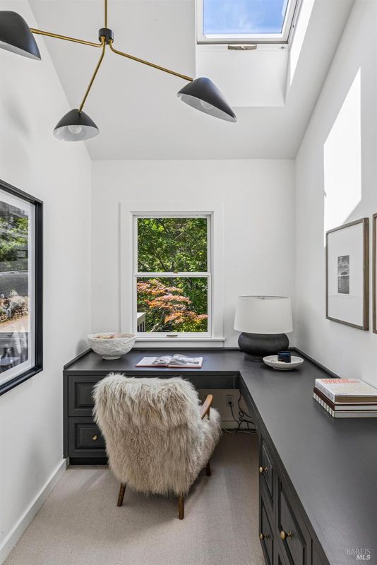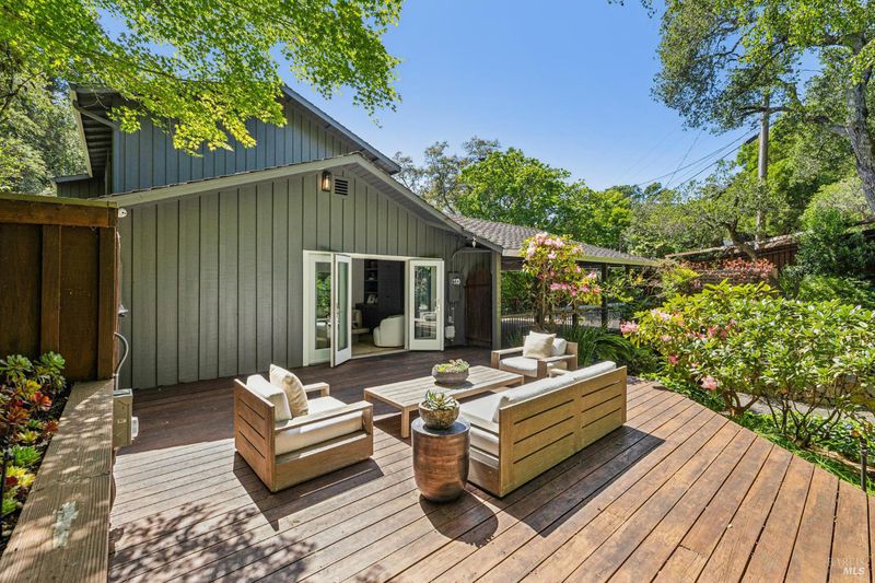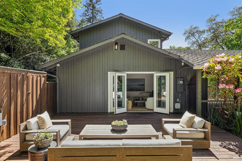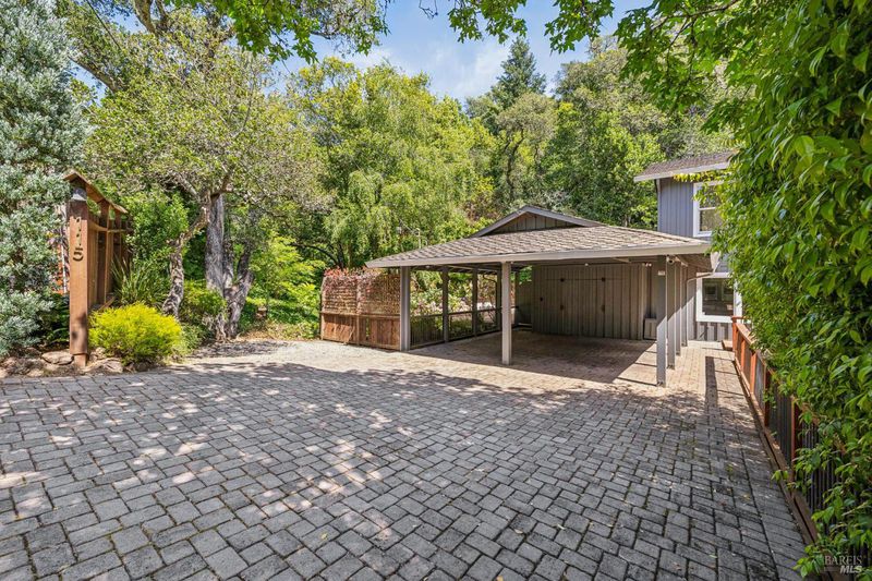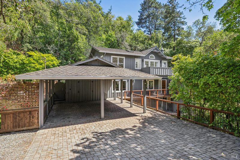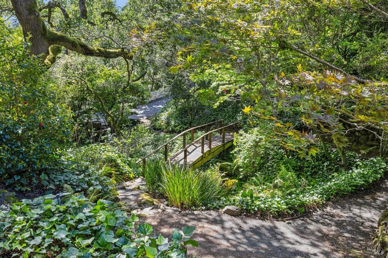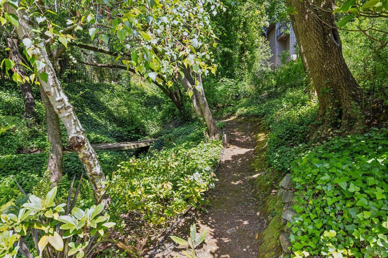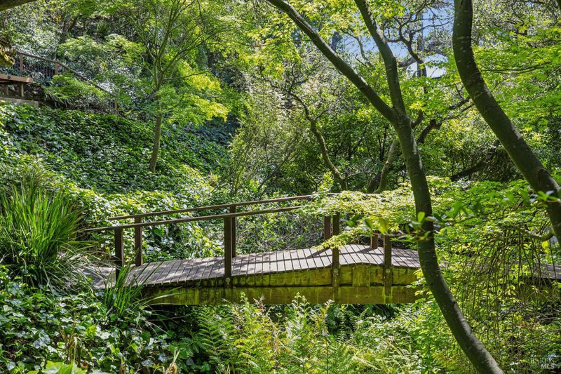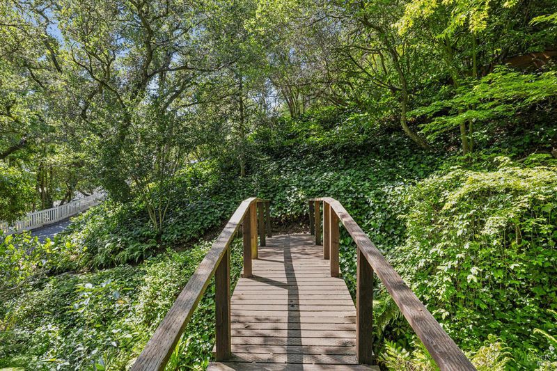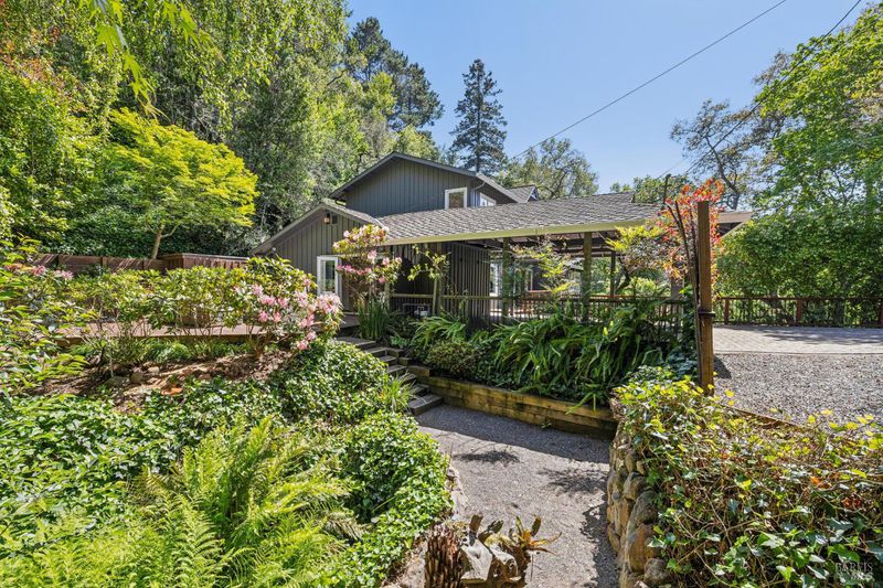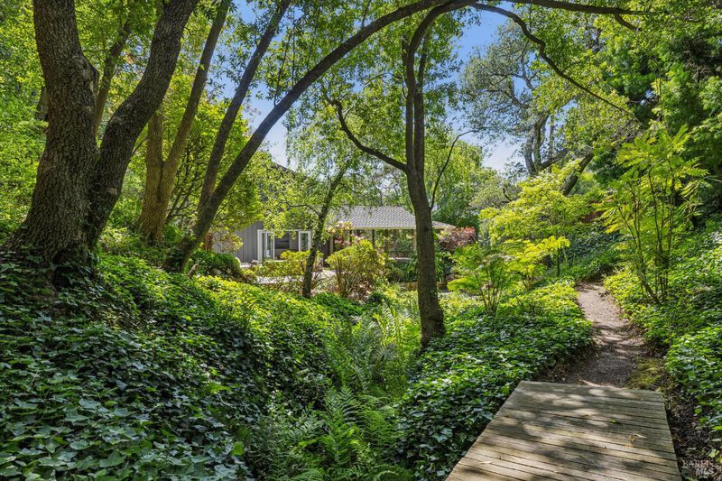 Hidden in Boyle Park, 115 Manor Drive sits on nearly half an acre of mature oaks, Japanese maples, and a seasonal creek that create something closer to a private nature preserve than a residential lot. A wooden footbridge connects the upper and lower grounds. Garden paths wind through ferns. The house sits on a corner lot almost invisible from the street. Inside, the main level is anchored by a plaster fireplace and wrapped in floor-to-ceiling windows that keep the trees in constant view. The living and dining areas flow naturally into each other, with hardwood floors throughout and vaulted ceilings that give the space real presence. The kitchen has skylights, a professional range, butcher block and stone counters, and double doors that open to a deck above the garden. Two bedrooms on this level, one with an ensuite bath and its own deck access. Upstairs, the primary suite has a walk-in closet and spa bath. A second ensuite bedroom and a dedicated office area complete the upper level. The lower level has a private entrance and half bath, well-suited for a guest suite, studio, or workspace that genuinely feels removed from the rest of the house. Outside, multiple decks sit at different elevations among the trees. A covered two-car carport plus driveway parking for five total cars, with EV charging, and ample storage.
