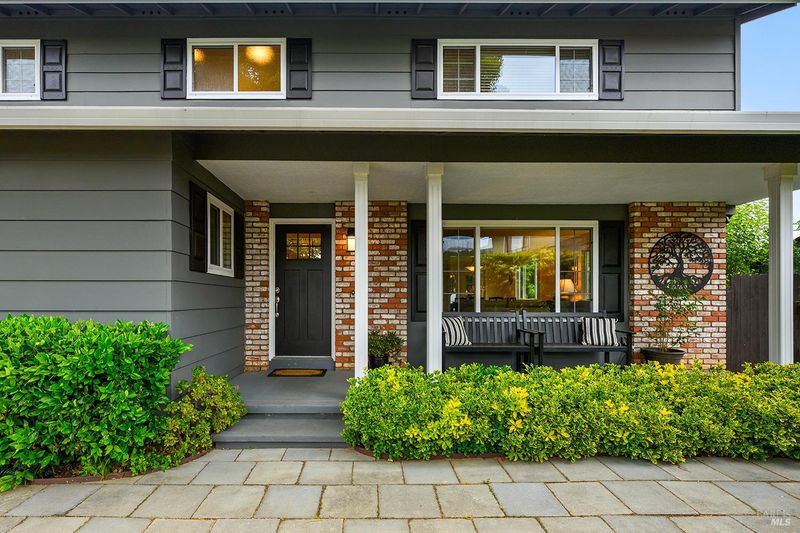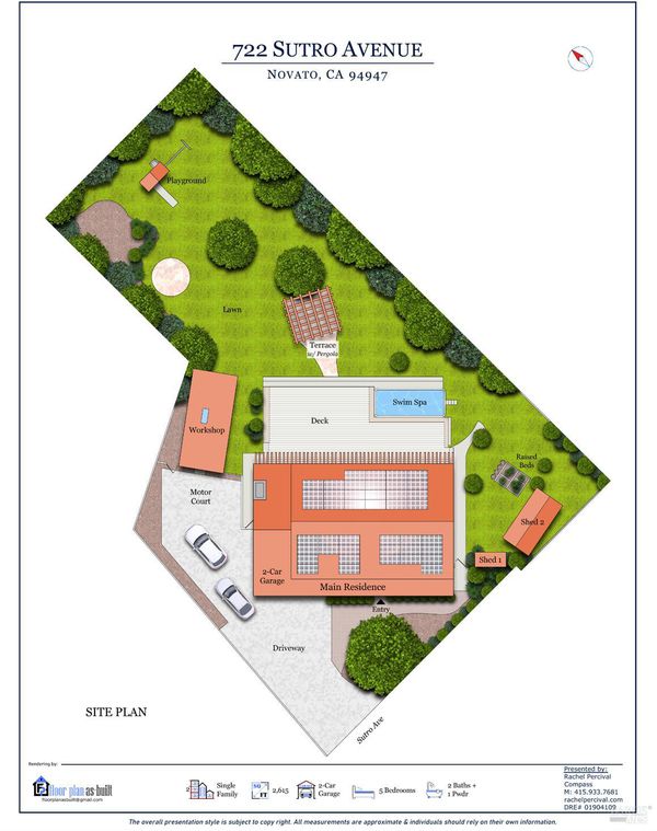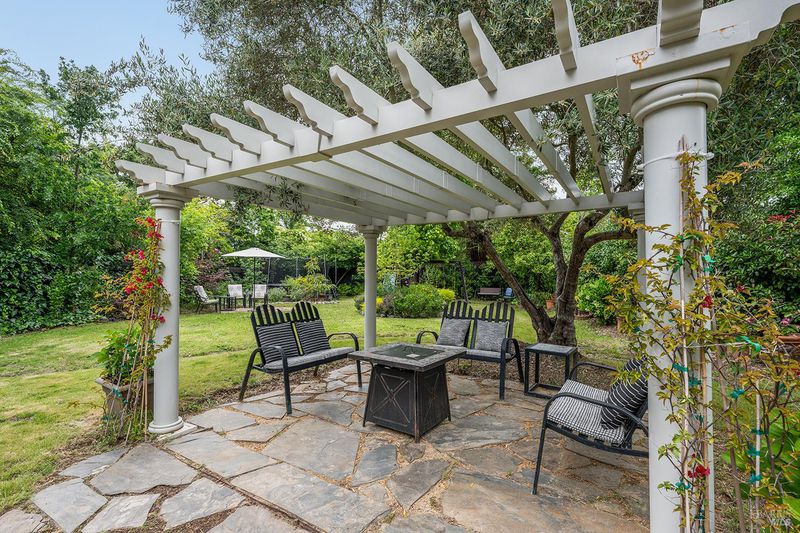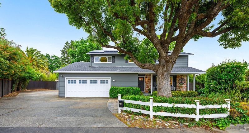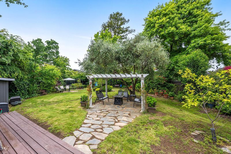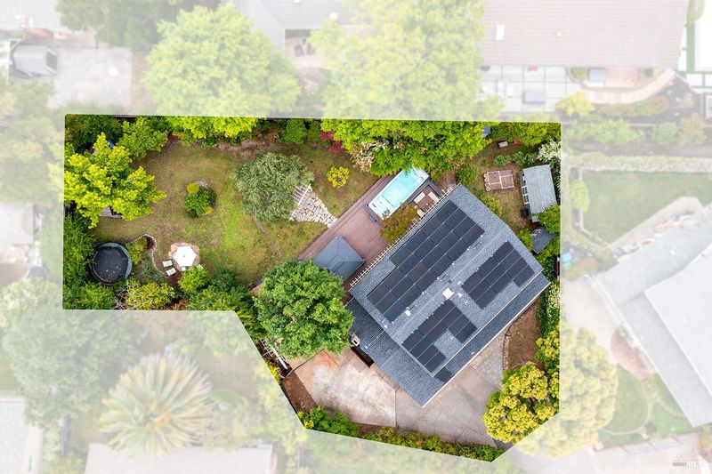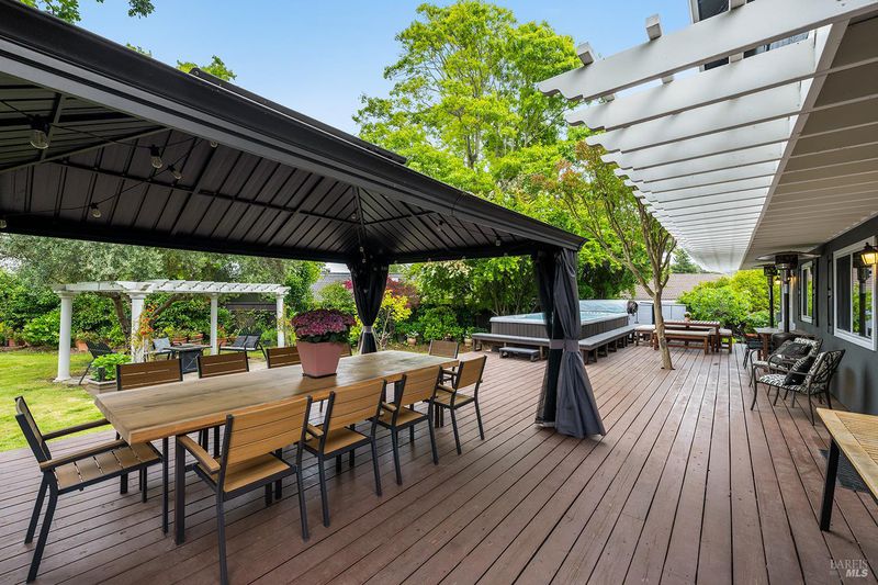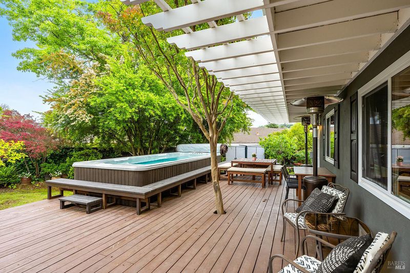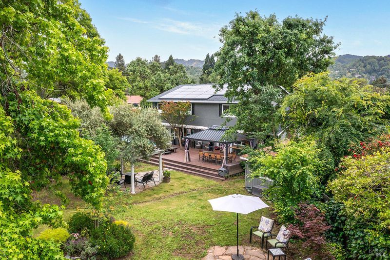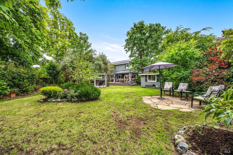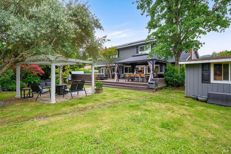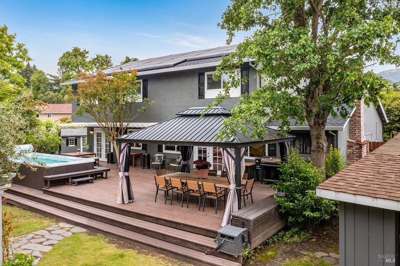 Tucked away at the end of a private driveway shared with just four other homes, 722 Sutro Avenue offers a rare combination of privacy, space, and a truly exceptional outdoor setting. The expansive, park-like backyard is a standout feature, thoughtfully designed with a gazebo, swim spa, multiple storage sheds, lush lawn, mature fruit trees, and a spacious deck, creating the perfect environment for enjoying the outdoors year-round. Inside, the home features a functional and inviting layout with an open-plan eat-in kitchen complete with a freestanding island, abundant counter space, and seamless flow into the adjoining family room with a cozy fireplace and direct access to the rear garden. A formal dining room also opens to the yard, enhancing indoor-outdoor living, while the separate living room offers built-in shelving and a comfortable retreat. Stained bamboo floors add warmth and character throughout the main level, which also includes a convenient half bath and dedicated laundry room. Upstairs, you'll find five generously sized bedrooms and two full bathrooms, including a spacious primary suite with a walk-in closet. Additional highlights include a charming front porch, ample off-street parking for four or more vehicles, a two-car garage, and leased solar with battery backup for energy efficiency and peace of mind. Set in a peaceful location with exceptional outdoor amenities and versatile living spaces, this home presents a unique opportunity to enjoy both comfort and privacy in a desirable Novato setting.