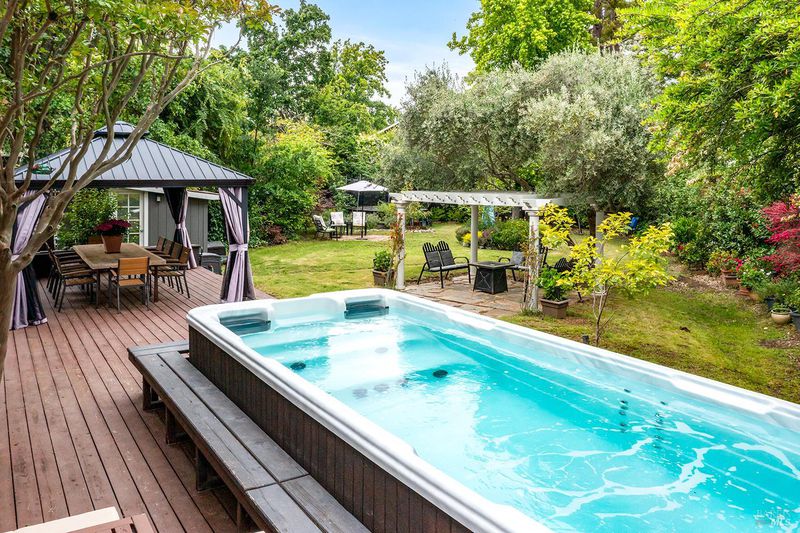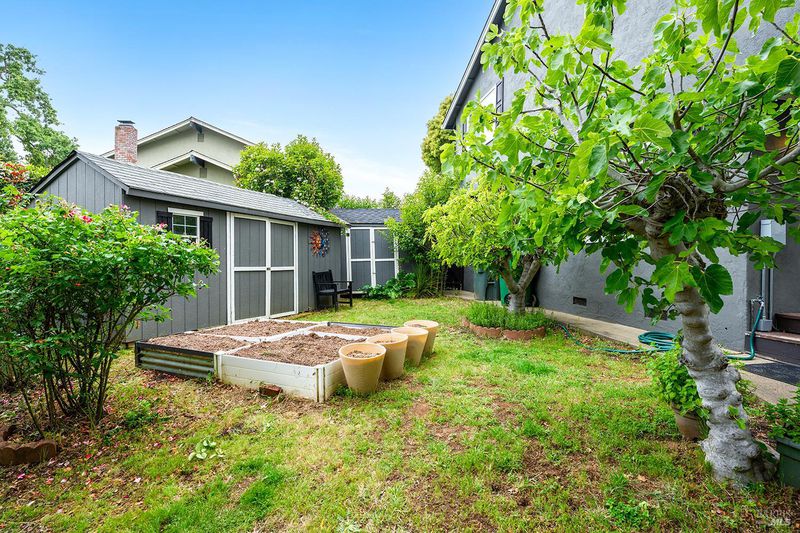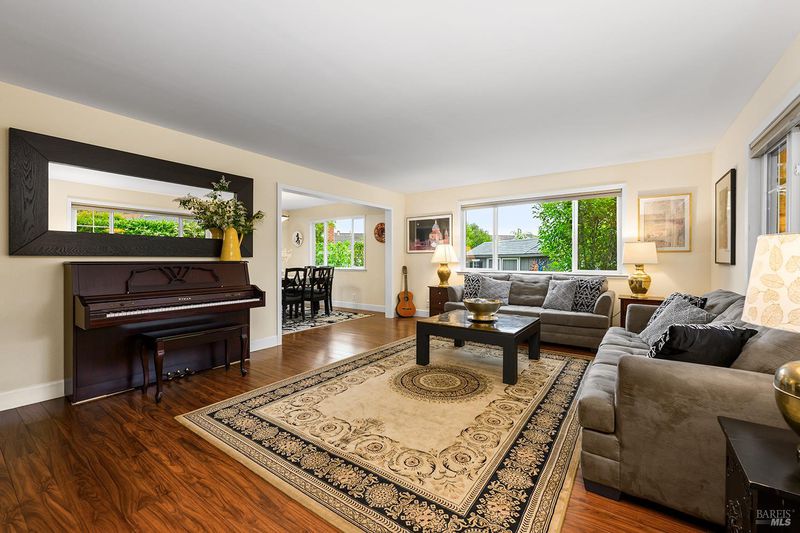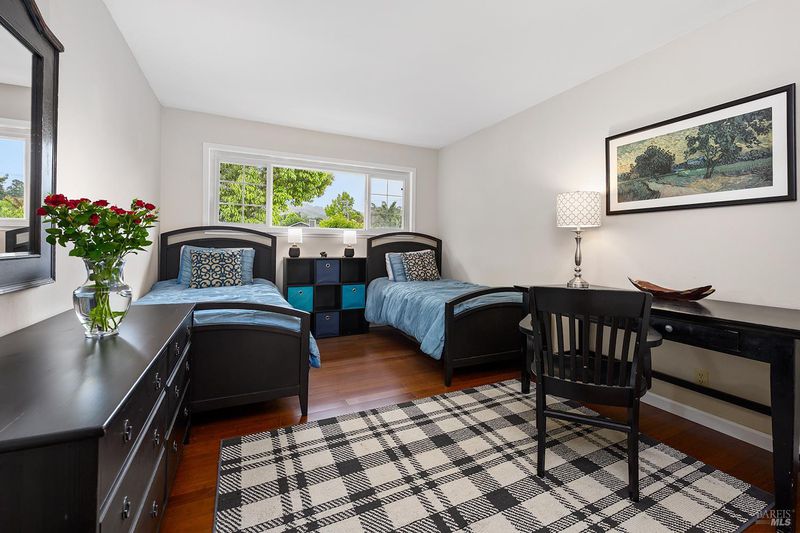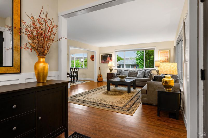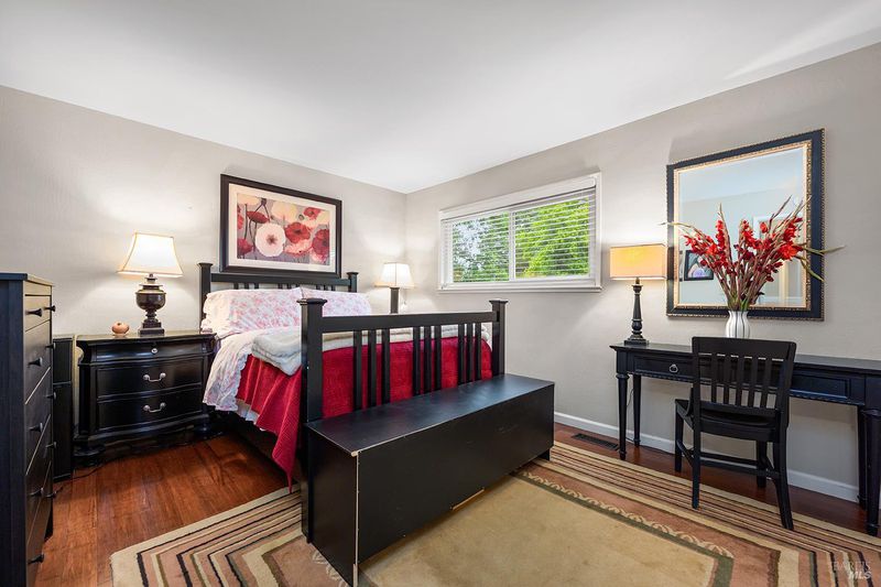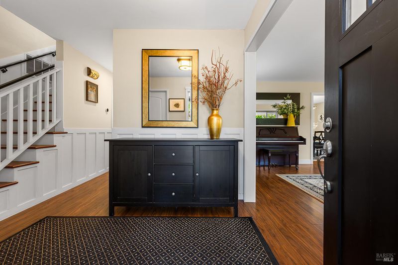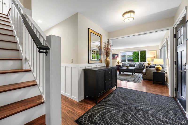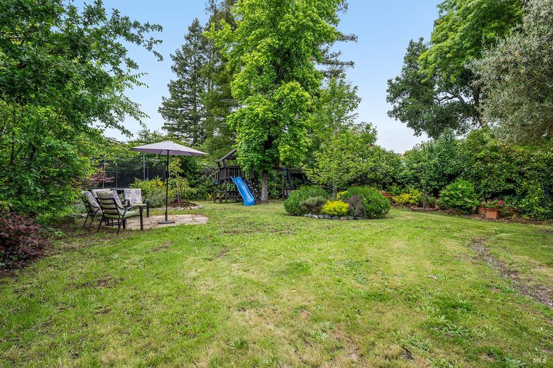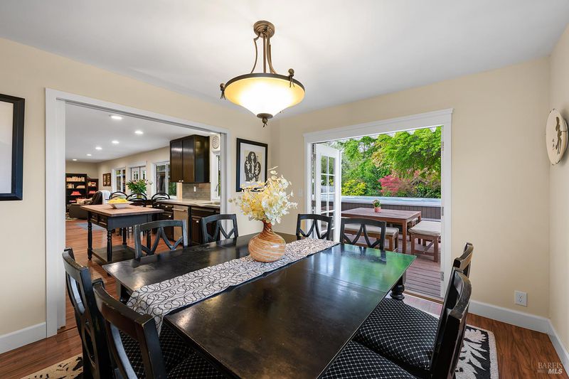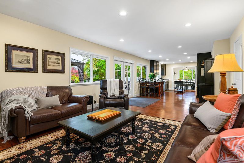 Tucked away at the end of a private driveway shared with just four other homes, 722 Sutro Avenue offers a rare combination of privacy, space, and a truly exceptional outdoor setting. The expansive, park-like backyard is a standout feature, thoughtfully designed with a gazebo, swim spa, multiple storage sheds, lush lawn, mature fruit trees, and a spacious deck, creating the perfect environment for enjoying the outdoors year-round. Inside, the home features a functional and inviting layout with an open-plan eat-in kitchen complete with a freestanding island, abundant counter space, and seamless flow into the adjoining family room with a cozy fireplace and direct access to the rear garden. A formal dining room also opens to the yard, enhancing indoor-outdoor living, while the separate living room offers built-in shelving and a comfortable retreat. Stained bamboo floors add warmth and character throughout the main level, which also includes a convenient half bath and dedicated laundry room. Upstairs, you'll find five generously sized bedrooms and two full bathrooms, including a spacious primary suite with a walk-in closet. Additional highlights include a charming front porch, ample off-street parking for four or more vehicles, a two-car garage, and leased solar with battery backup for energy efficiency and peace of mind. Set in a peaceful location with exceptional outdoor amenities and versatile living spaces, this home presents a unique opportunity to enjoy both comfort and privacy in a desirable Novato setting.