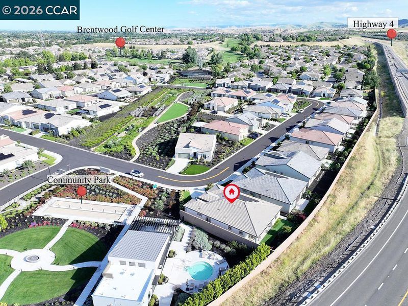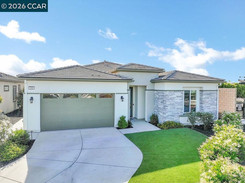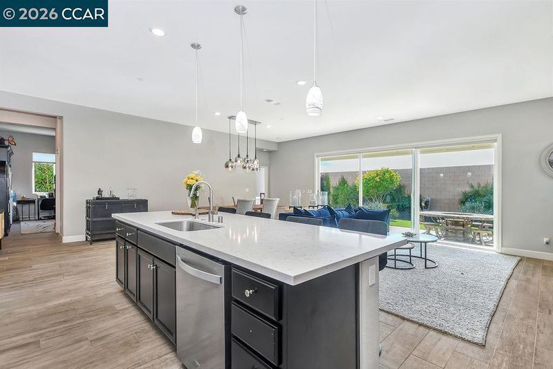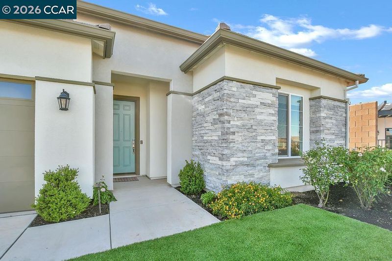 Welcome to 208 Chinook Dr., a beautifully maintained single-story home in the sought-after Kindred & Balfour community by Shea Homes — Brentwood's intimate 55+ neighborhood. Built in 2022, this 3-bedroom, 2-bath residence lives like a model, with custom lighting throughout and an open-concept layout designed for easy, elegant living. The chef's kitchen features espresso cabinetry paired with Silestone countertops, flowing seamlessly into the dining and living spaces. Step through the stunning 15-foot multi-panel sliding door and find yourself in a covered outdoor patio surrounded by lush, extensively landscaped front and back yards — designed for year-round entertaining or quiet evenings under the California sky. Wood-style tile floors run through main living areas, with carpet in the bedrooms for comfort. The primary bath includes solid surface countertops and a spa-style shower surround. Additional cabinetry in the laundry room keeps everything organized and out of sight, and solar panels to keep utility costs low. Residents enjoy access to a planned clubhouse with a community kitchen, indoor/outdoor social spaces, pool, spa, pickleball, and bocce courts. Just minutes from Brentwood's parks, trails, wine country, and everyday shopping. This is the low-maintenance lifestyle buyers in this community are looking for — fully realized and ready to go.
