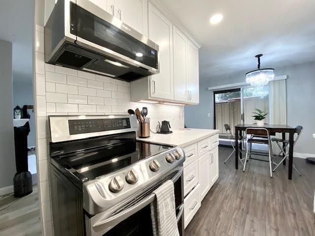 - Dishwasher, Garbage Disposal, Hood Over Range, Microwave, Countertop - Quartz, Exhaust Fan, Oven Range - Electric, Cooktop - Electric, Refrigerator