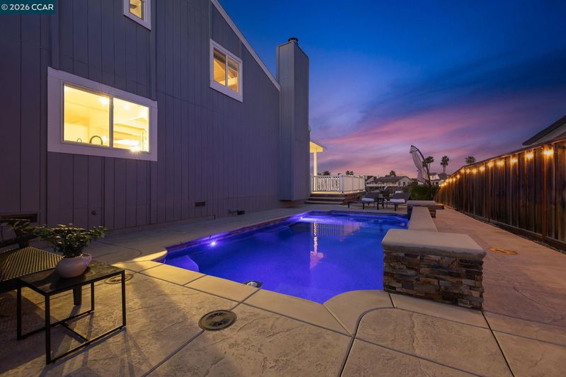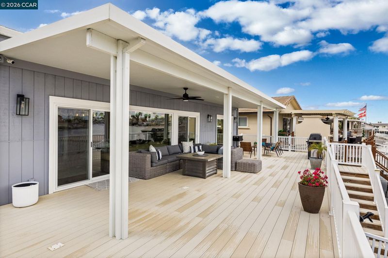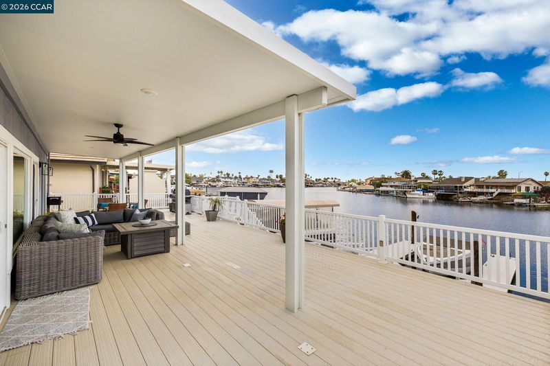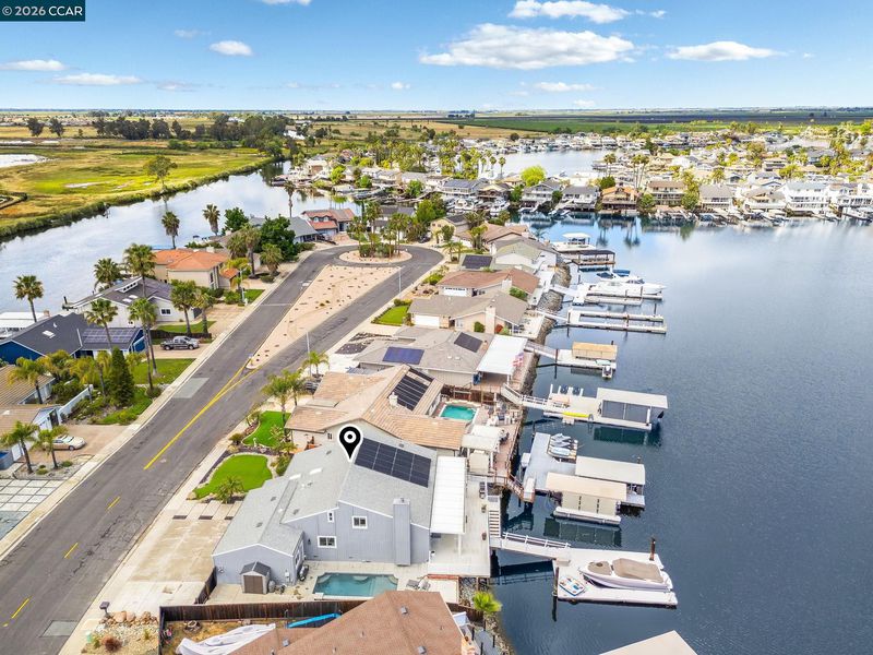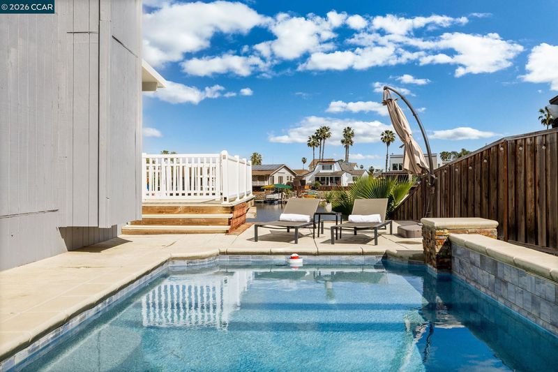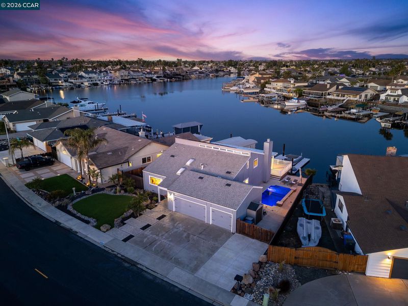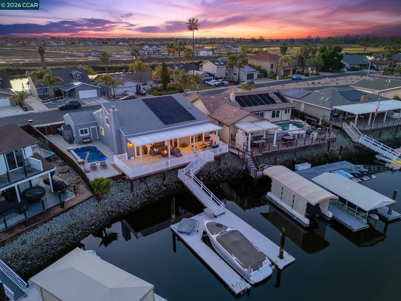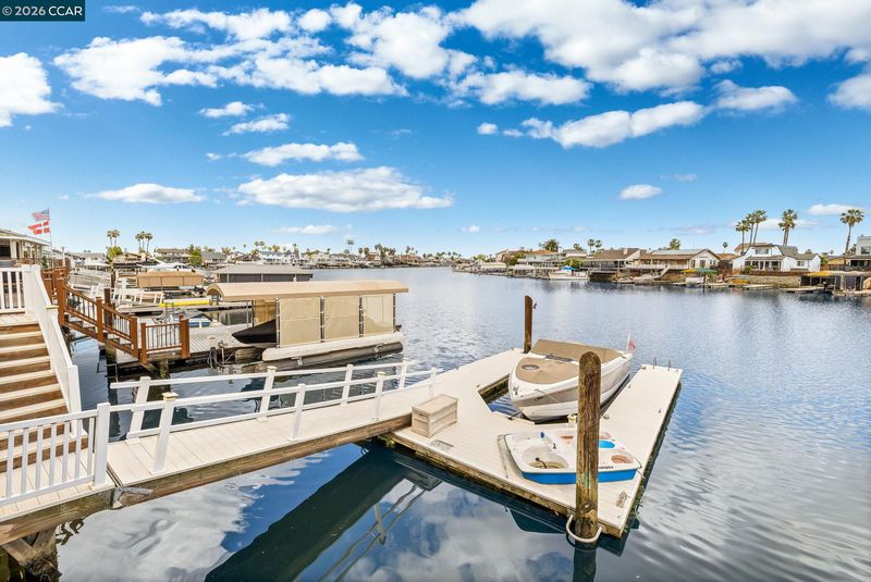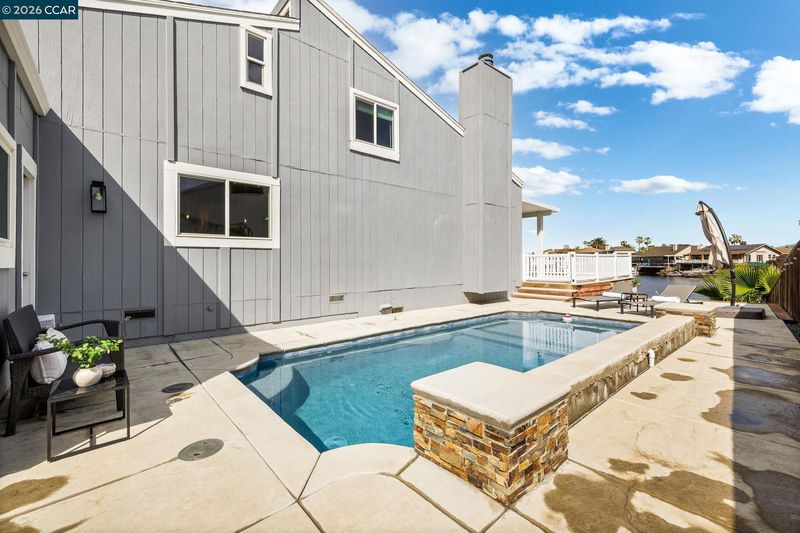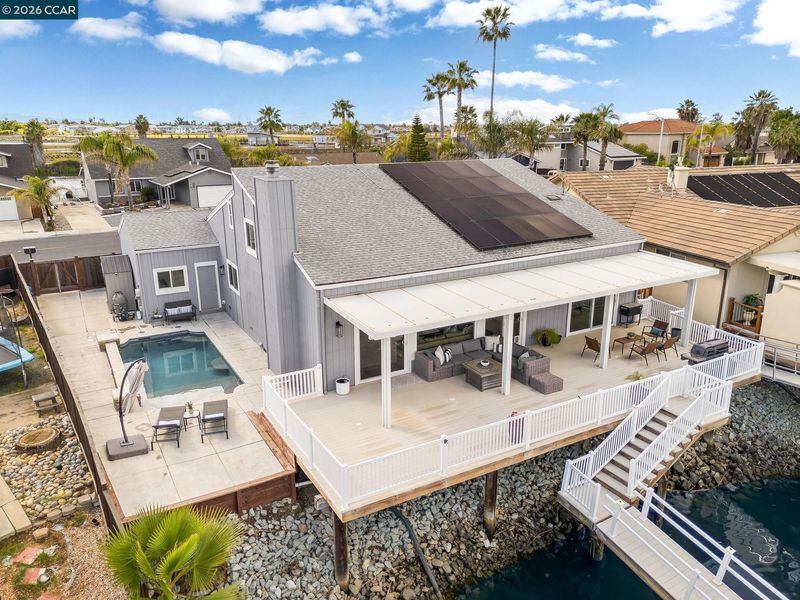 Waterfront home with a private boat dock, wide water views & quick access to fast water, paired with a rare in ground pool & extensive interior updates. Set within Cabrillo Bay on a wider section of the water with open sightlines & a desirable east facing rear exposure, this home captures the Discovery Bay lifestyle at its best. The main living areas are oriented to the view, with vaulted ceilings, exposed wood detail & expansive windows that bring in natural light. Multiple sliding doors open to a covered waterfront deck, creating a seamless indoor outdoor connection. The remodeled kitchen features shaker style cabinetry, quartz countertops, a large island with seating, double ovens, dual dishwashers, a beverage fridge & upgraded appliances, thoughtfully designed for both daily use & hosting. The main level includes the primary suite with direct access to the waterfront deck, a walk in closet & an ensuite bath, along with a second bedroom & full bath for added flexibility. The upper level offers a private retreat with an additional bedroom, full bath, loft or game area & finished attic space ideal for office, media or extended stays. Updated flooring, newer windows & modern lighting create a consistent, modern finish across the home. Outdoor living is where the property truly stands apart. The covered deck overlooks the water & connects directly to a private dock accommodating up to a 28.5 ft boat, making it easy to head out for a day on the Delta. A separate side yard features a newer in ground pool, creating distinct spaces to relax, entertain & enjoy the setting. Located in Discovery Bay, known for its waterfront lifestyle, boating & Delta access, the home is just minutes from the marina, yacht club, golf, local dining & Discovery Bay Elementary, offering a balance of recreation & everyday convenience. Owned solar with a grandfathered net metering plan & a 3 car garage with finished flooring add efficiency & functionality. A rare combination of water location, usable outdoor space, pool & thoughtful updates.