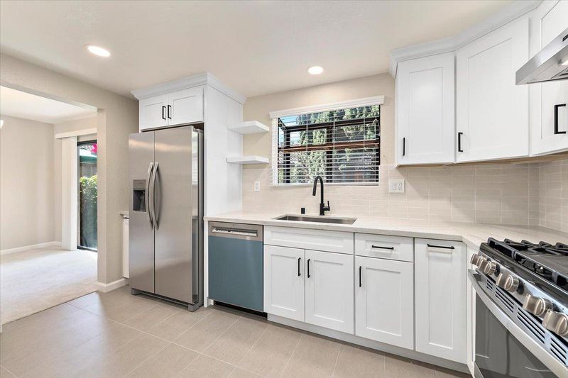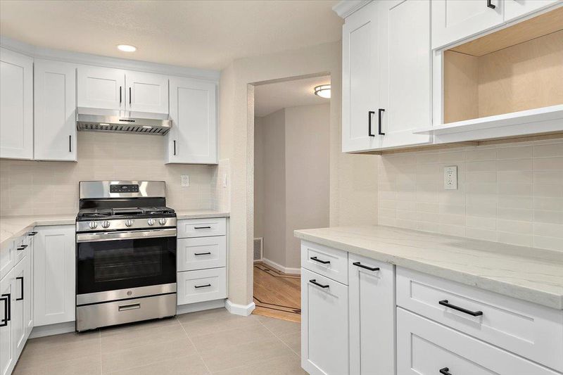 - Countertop - Quartz, Dishwasher, Garbage Disposal, Hood Over Range, Oven Range - Gas, Refrigerator