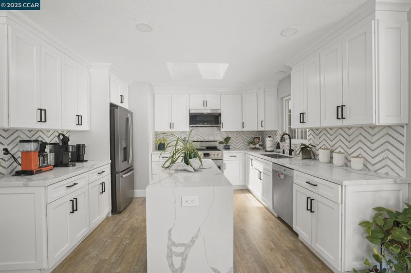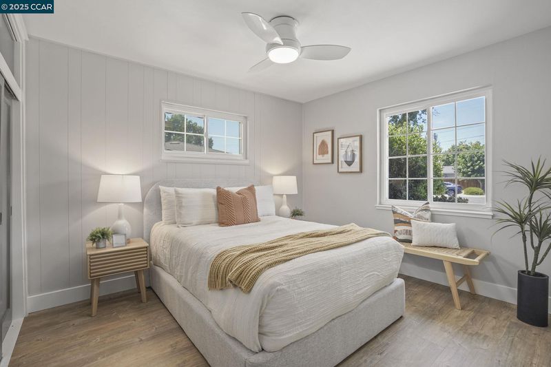 Tastefully updated single-story home on quiet Pleasant Hill court. 3 bedrooms, 2 full bathrooms, approx. 1,188 sq ft on 8,800 sq ft lot. Open-concept floor plan with updated flooring, recessed lighting, and remodeled kitchen featuring shaker cabinets, quartz counters, stainless steel appliances, and chevron tile backsplash. Primary bedroom includes remodeled en-suite bathroom. Additional bonus room ideal for office or flex space. Backyard features salt water pool, spa, patio, and low-maintenance landscaping. Detached garage and fresh exterior paint. Generous lot provides potential space for an ADU (Last photo is AI Rendering showing possibility) Convenient location close to shopping, dining, parks, and schools.