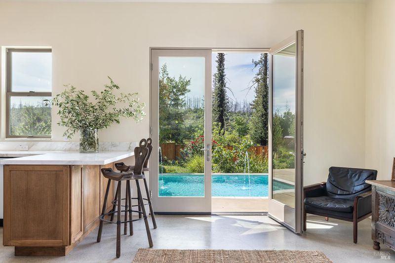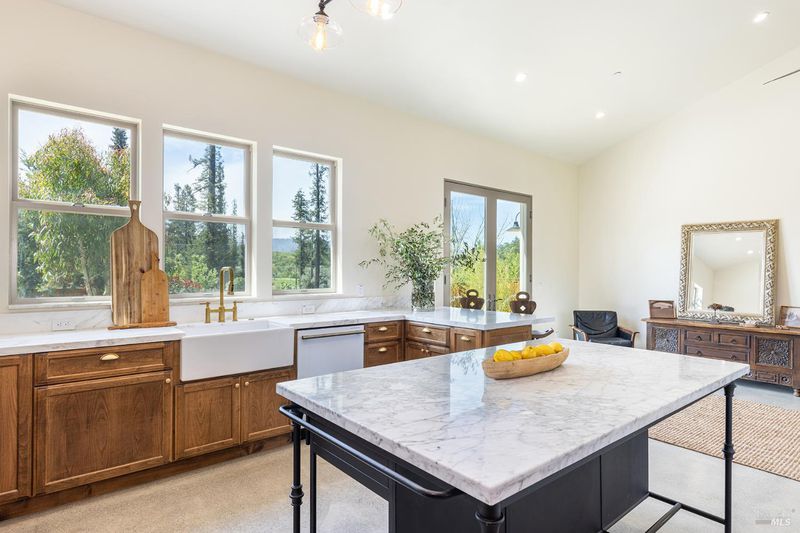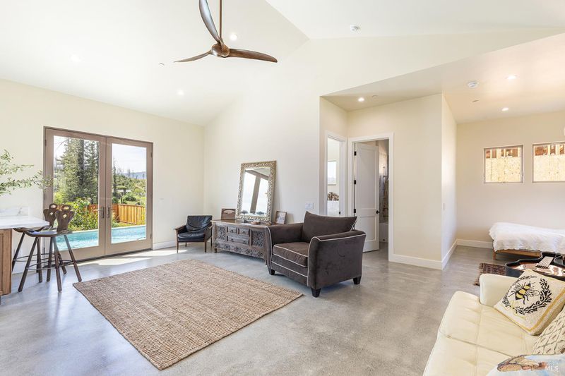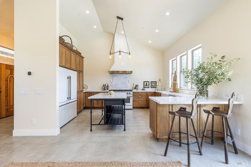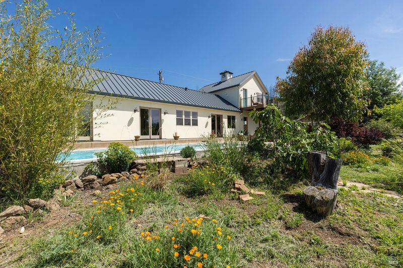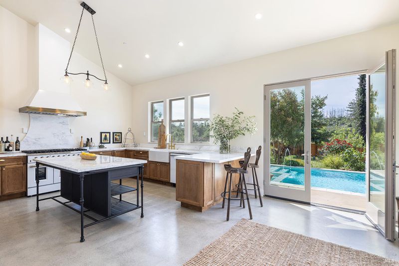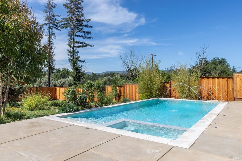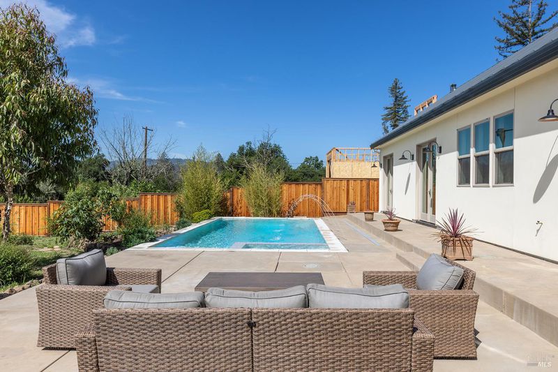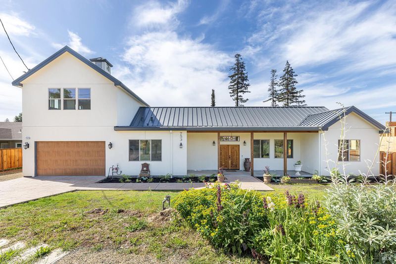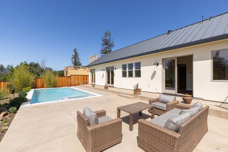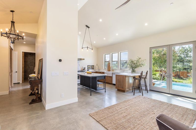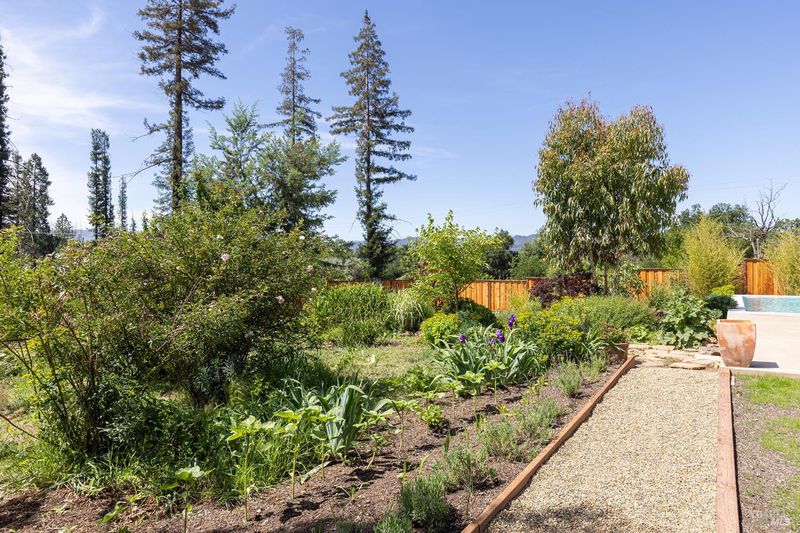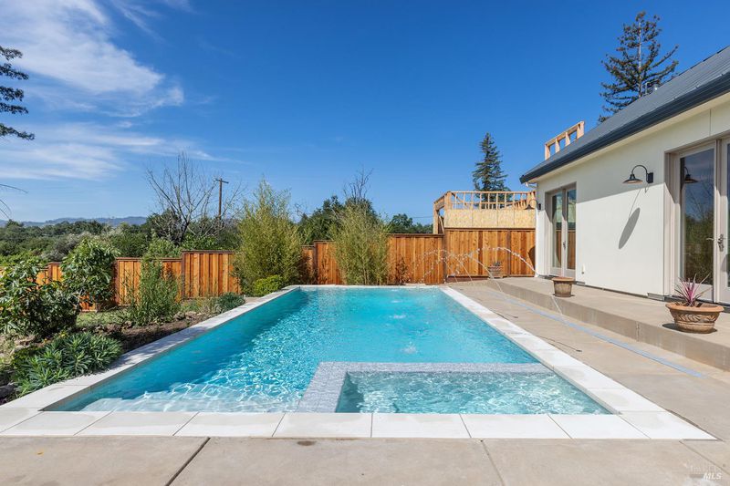 New construction with a true St. Helena sensibility, 753 Sunnyside Road brings together modern craftsmanship, thoughtful design, and an established Napa Valley garden setting. Set on +/- 0.39 acres, the +/- 2,100 square foot, 2 bedroom, 2 bathroom contemporary farmhouse was designed with careful attention to detail and a strong connection to outdoor living. Inside, vaulted ceilings, polished concrete floors, and hand-carved solid wood double doors establish an immediate sense of quality. The kitchen earns the description 48 Forno range, Shaw's farmhouse sink, oversized refrigerator, custom plaster hood, Calacatta marble countertops, warm wood cabinetry, brass hardware, and a large island with breakfast bar seating. A French country kitchen in the truest sense. The vaulted primary suite opens to the pool terrace through French doors. Both full baths are finished with equal intention: one with a curbless stone tile shower, pebble mosaic floor, brass rain fixture, dark wood vanity, and Calacatta marble counter; the other appointed with the same brass hardware and considered detailing throughout. A loft above the garage offers flexible space for an office, studio, or guest overflow. Outdoors, the property offers the feel of a private resort while still reflecting the character of Napa Valley living. A new rectangular pool and spa are framed by stone coping and a generous concrete surround, with a deck above for shaded lounging or al fresco dining. A true chef's garden anchors the landscape mature fruit trees, flowering borders, flagstone paths, and garden beds with ample land to cultivate further or simply let it remain the secret garden it already is. Additional features include a well-appointed laundry room with full cabinetry, utility sink, and stacked washer/dryer, plus an oversized finished garage with recessed lighting and interior access. This is a rare opportunity to own a newly built home in St. Helena with elevated finishes, mature landscaping, and a warm, lived-in character from day one.