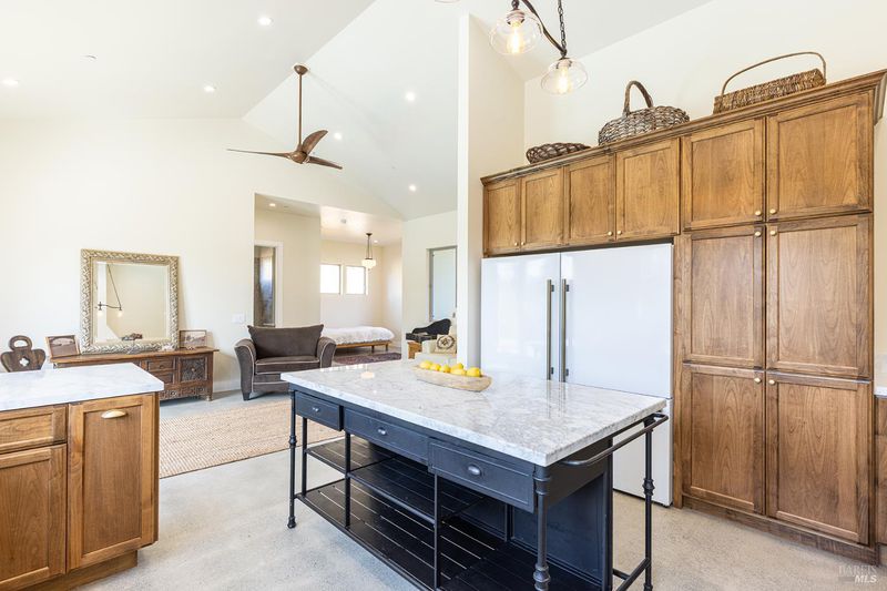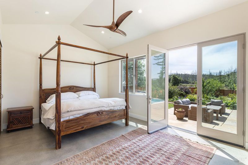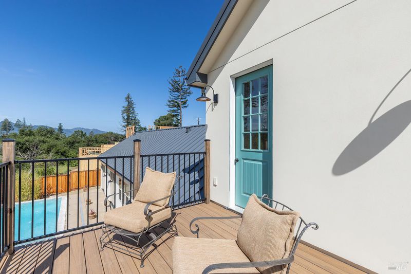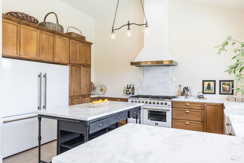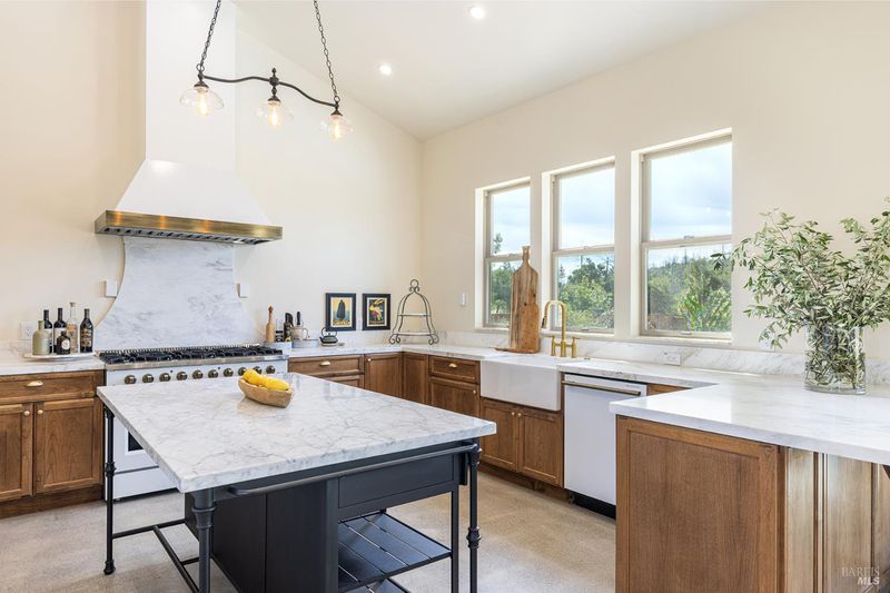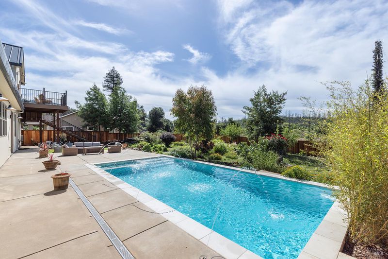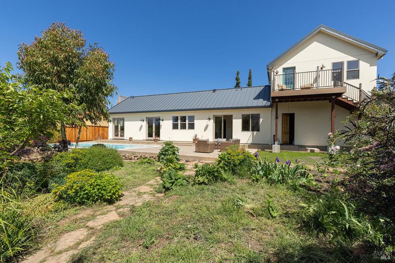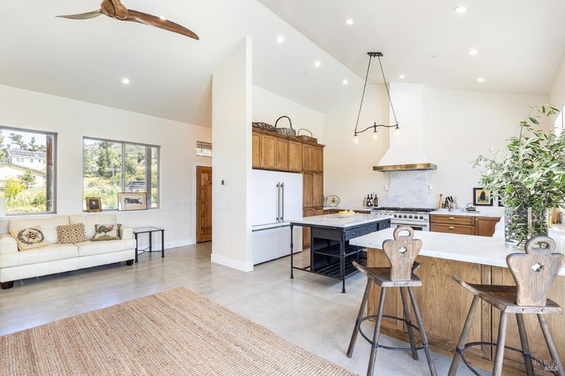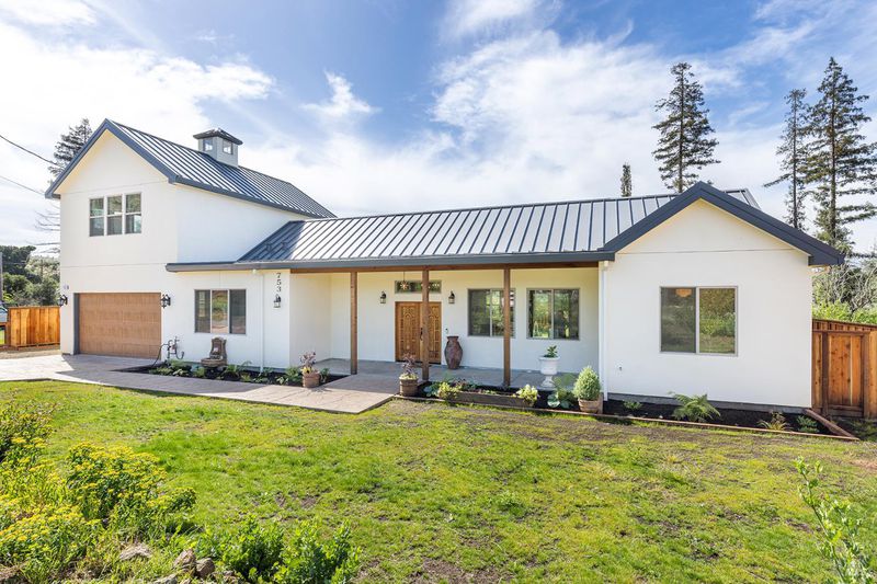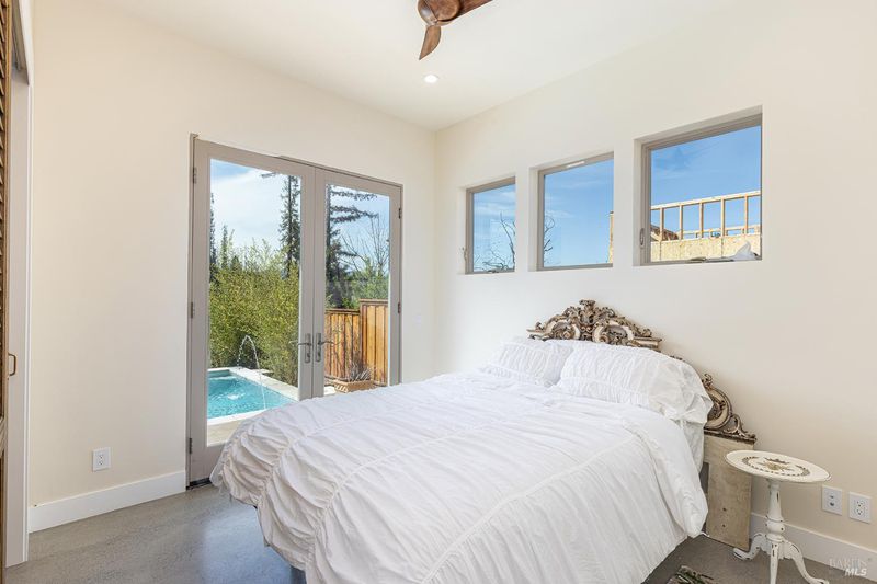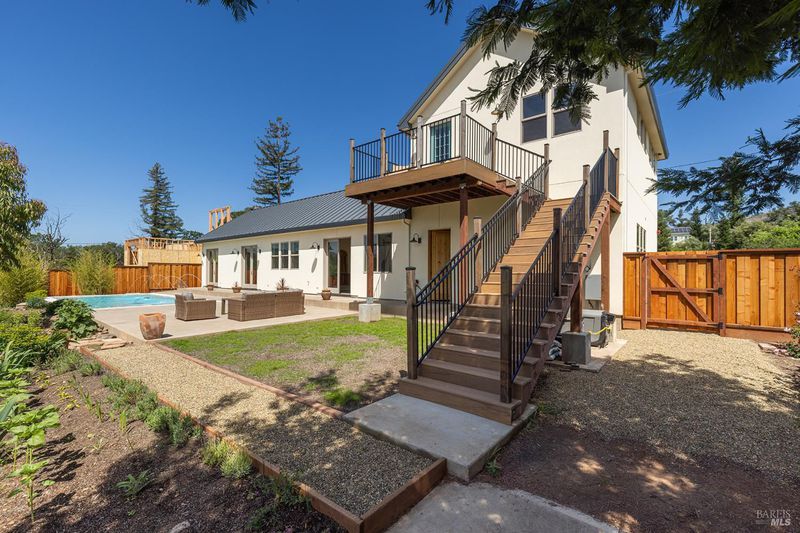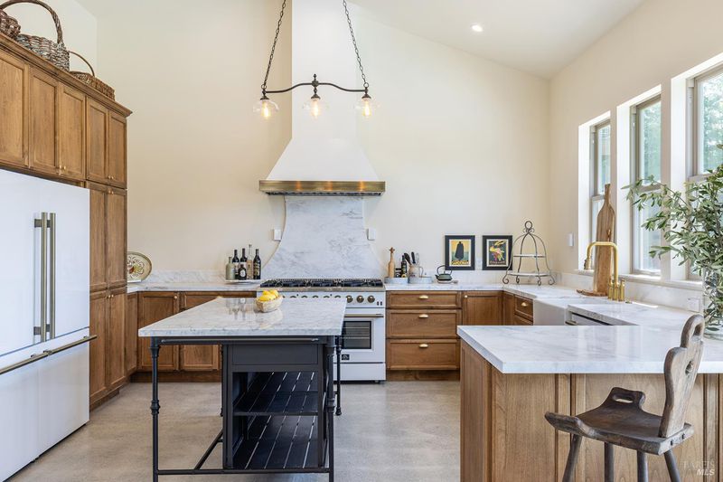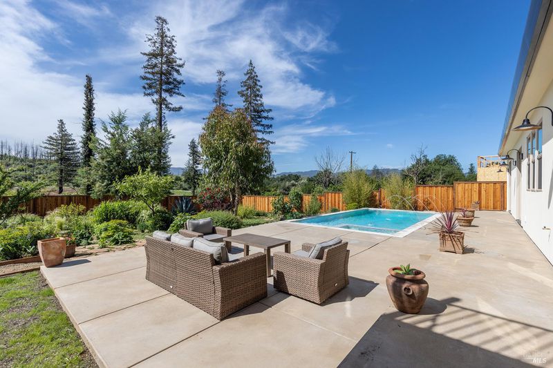 New construction with a true St. Helena sensibility, 753 Sunnyside Road brings together modern craftsmanship, thoughtful design, and an established Napa Valley garden setting. Set on +/- 0.39 acres, the +/- 2,100 square foot, 2 bedroom, 2 bathroom contemporary farmhouse was designed with careful attention to detail and a strong connection to outdoor living. Inside, vaulted ceilings, polished concrete floors, and hand-carved solid wood double doors establish an immediate sense of quality. The kitchen earns the description 48 Forno range, Shaw's farmhouse sink, oversized refrigerator, custom plaster hood, Calacatta marble countertops, warm wood cabinetry, brass hardware, and a large island with breakfast bar seating. A French country kitchen in the truest sense. The vaulted primary suite opens to the pool terrace through French doors. Both full baths are finished with equal intention: one with a curbless stone tile shower, pebble mosaic floor, brass rain fixture, dark wood vanity, and Calacatta marble counter; the other appointed with the same brass hardware and considered detailing throughout. A loft above the garage offers flexible space for an office, studio, or guest overflow. Outdoors, the property offers the feel of a private resort while still reflecting the character of Napa Valley living. A new rectangular pool and spa are framed by stone coping and a generous concrete surround, with a deck above for shaded lounging or al fresco dining. A true chef's garden anchors the landscape mature fruit trees, flowering borders, flagstone paths, and garden beds with ample land to cultivate further or simply let it remain the secret garden it already is. Additional features include a well-appointed laundry room with full cabinetry, utility sink, and stacked washer/dryer, plus an oversized finished garage with recessed lighting and interior access. This is a rare opportunity to own a newly built home in St. Helena with elevated finishes, mature landscaping, and a warm, lived-in character from day one.