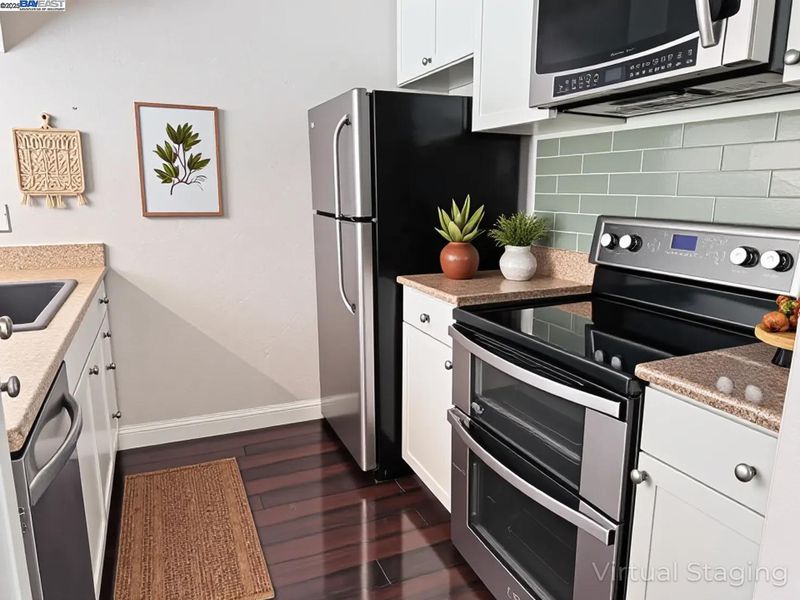 - Dishwasher, Electric Range, Microwave, Range, Refrigerator, Breakfast Bar, Counter - Solid Surface, Electric Range/Cooktop, Disposal, Range/Oven Built-in, Updated Kitchen