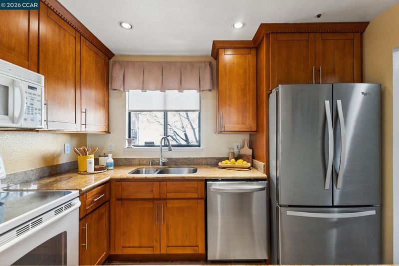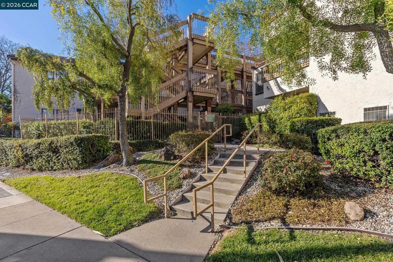Light-filled and ideally located, this top-floor 1-bedroom, 1-bath corner condo offers 670 square feet of comfortable, open-concept living just moments from downtown Walnut Creek. Vaulted ceilings and abundant natural light create an airy feel, while the gas fireplace anchors the living space with warmth and character. The updated kitchen features granite countertops and flows seamlessly into the living and dining areas—perfect for everyday living and entertaining. Step out onto the private balcony to unwind and enjoy the elevated outlook. Additional highlights include in-unit washer and dryer, a dedicated parking space, a ceiling fan in the living room, and a thoughtful mix of carpet and tile flooring. Set within a well-maintained community offering a resort-style pool, jacuzzi, and clubhouse. HOA dues include water and trash. Located near top-rated schools, shopping, dining, BART, and commuter routes, this home delivers convenience, comfort, and lifestyle in one smart package.