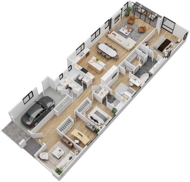 A brand-new, PRE-CONSTRUCTION home in prime Cupertino location near Monta Vista High & Apple campus. With high vaulted ceilings, a striking pivot-style front door, & covered entry porch. The living room has floor-to-ceiling picture window, while the family room includes a high vaulted ceiling, wood ceiling panels, skylights, recessed lighting, black-framed windows, a custom slat-wood accent wall, a floating cabinet, & expansive glass doors. The kitchen features cabinetry, full-height backsplash, stainless steel appliances: French-door refrigerator, double oven, range, hood, & dishwasher along with a waterfall-edged island, sliding window, breakfast bar, & dining area. The primary suite offers a large picture window & walk-in closet. The primary bathroom features decorative accent tile, shower accent wall, freestanding tub, glass shower enclosure, backlit mirror, double-sink floating vanity, & water closet. Additional amenities include a dedicated office space, bedrooms with built-in closets, & Jack-and-Jill bathroom with a dual-sink floating vanity & frameless glass shower enclosure. The hallway bath offers a vanity plus tub & shower. Hallway closets, laundry area, spacious deck, & landscaped front & backyard.