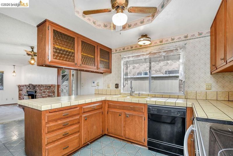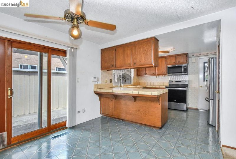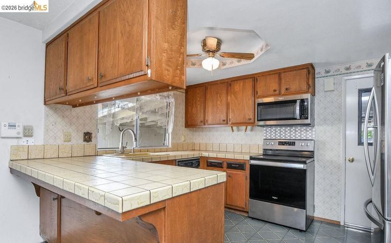 - Dishwasher, Electric Range, Microwave, Refrigerator, Breakfast Bar, Tile Counters, Eat-in Kitchen, Electric Range/Cooktop, Disposal