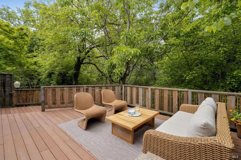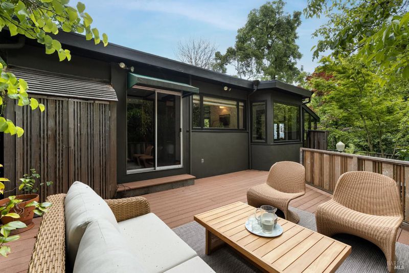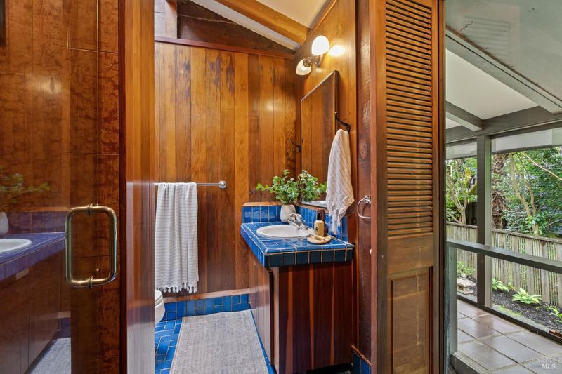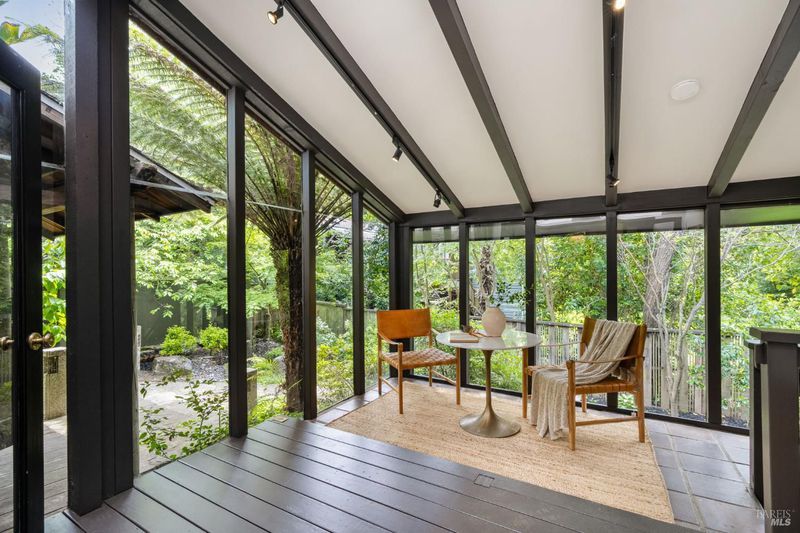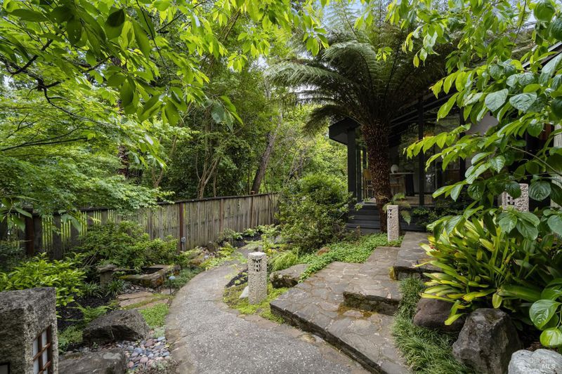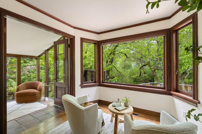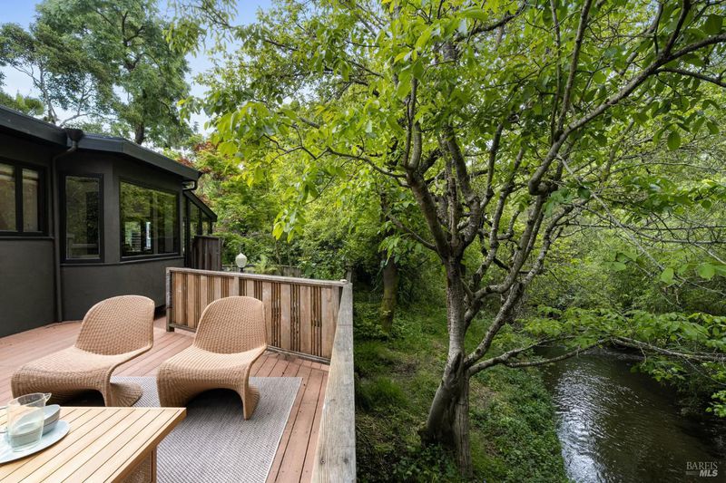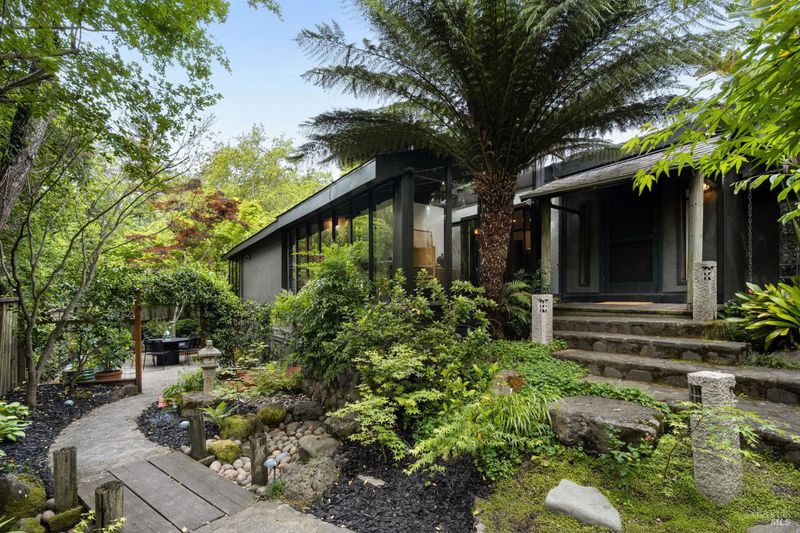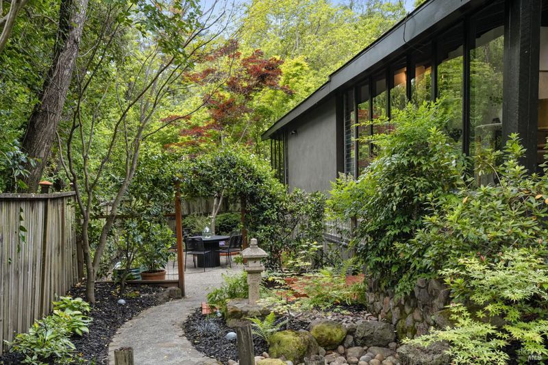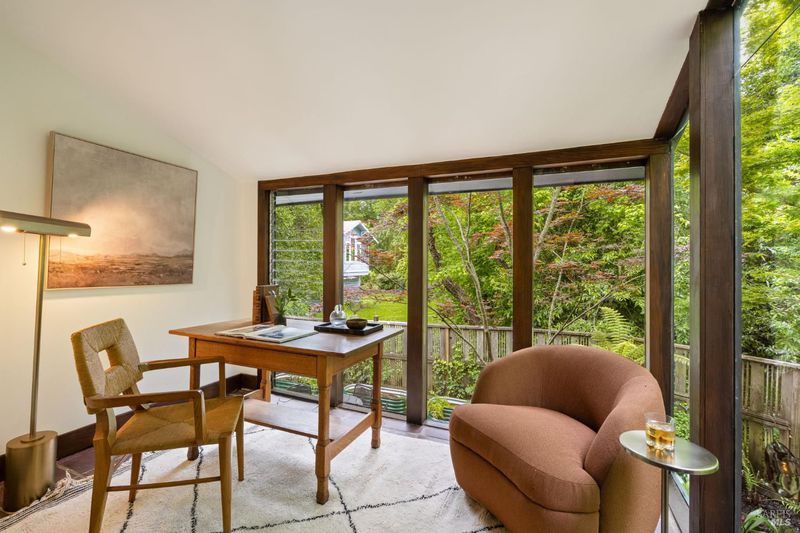 Welcome to 53 SFD, an eclectic 1949 home blending Japanese-inspired design with mid-century influences, where craftsmanship, natural materials, and a strong connection to nature define the experience. A private driveway lined with bamboo, fig, and mature trees accommodates 4-5 cars and creates a peaceful buffer from the street. Beyond a traditional Japanese-style gate, shaded by a flowering cherry tree, the home opens to a serene garden with layered plantings, stepping stones, and a zen fountain. The pathway was designed to echo falling cherry blossoms, beautifully realized each spring. Inside, the home is rich with character. Redwood paneling, stained glass windows, vintage tile work, and distinct rooms create warmth and individuality throughout. A stained-glass dome skylight crowns the entry, casting colored light across the space. The main living room is anchored by a substantial brick fireplace and flows to a glass-enclosed sunroom overlooking the gardens. The kitchen balances charm and function with butcher block countertops, and a Viking range. Nearby, a cozy family room offers a casual place to gather or entertain. A formal library could be a 3rd bedroom. It is wrapped in floor-to-ceiling wood paneling, with built-in shelving and its own fireplace, creates an intimate retreat rarely found today. Across 2,389 square feet, the layout offers flexibility with two bedrooms, an office, and two sunrooms. Below, an expansive 1,814-square-foot basement provides exceptional storage space rarely seen in Marin. The primary suite opens to a bright sitting area with picture windows oriented toward Corte Madera Creek just beyond. An adjoining glass-enclosed workspace enhances the connection to nature. The en-suite bath adds personality with cobalt blue vintage tile and rich wood paneling. The secondary bedroom sits adjacent to the library, with sliding doors opening directly to the deck. A nearby full bath continues the home's timeless style with a clawfoot tub and separate shower. Outdoor living is equally special, with a split-level deck designed for entertaining or quiet relaxation beside the creek, where deer, birds, and seasonal steelhead salmon are often seen. Positioned on the border of Ross and San Anselmo, the location offers easy access to cafs, trails around Phoenix Lake, dining, shopping, top-rated schools, and a vibrant community delivering both convenience and escape in one remarkable setting.