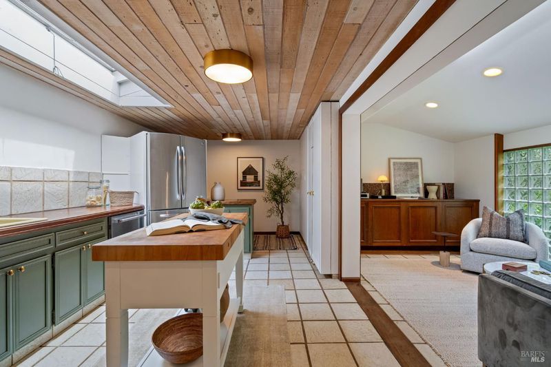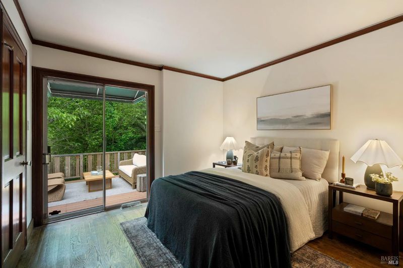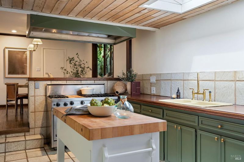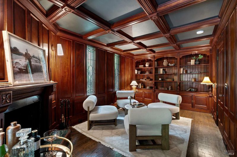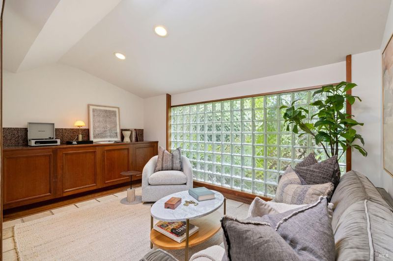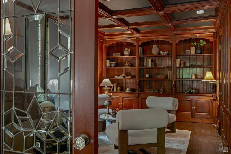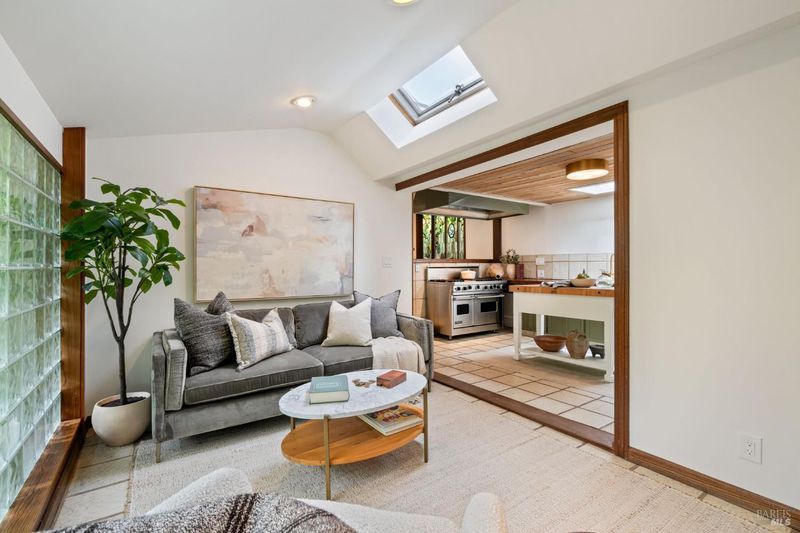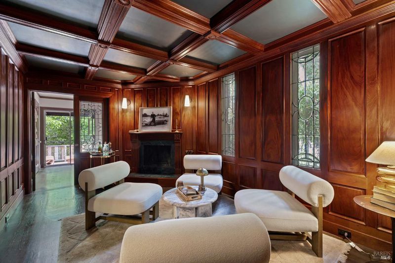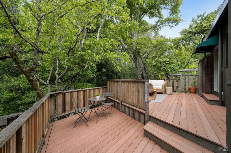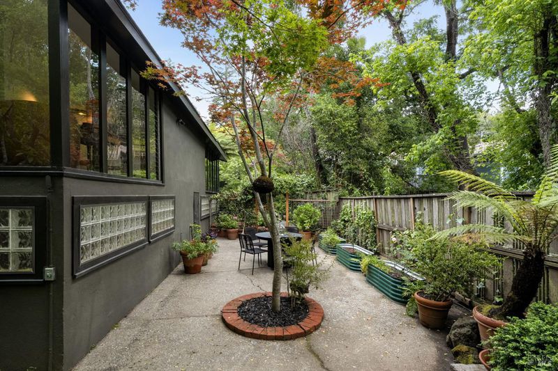 Welcome to 53 SFD, an eclectic 1949 home blending Japanese-inspired design with mid-century influences, where craftsmanship, natural materials, and a strong connection to nature define the experience. A private driveway lined with bamboo, fig, and mature trees accommodates 4-5 cars and creates a peaceful buffer from the street. Beyond a traditional Japanese-style gate, shaded by a flowering cherry tree, the home opens to a serene garden with layered plantings, stepping stones, and a zen fountain. The pathway was designed to echo falling cherry blossoms, beautifully realized each spring. Inside, the home is rich with character. Redwood paneling, stained glass windows, vintage tile work, and distinct rooms create warmth and individuality throughout. A stained-glass dome skylight crowns the entry, casting colored light across the space. The main living room is anchored by a substantial brick fireplace and flows to a glass-enclosed sunroom overlooking the gardens. The kitchen balances charm and function with butcher block countertops, and a Viking range. Nearby, a cozy family room offers a casual place to gather or entertain. A formal library could be a 3rd bedroom. It is wrapped in floor-to-ceiling wood paneling, with built-in shelving and its own fireplace, creates an intimate retreat rarely found today. Across 2,389 square feet, the layout offers flexibility with two bedrooms, an office, and two sunrooms. Below, an expansive 1,814-square-foot basement provides exceptional storage space rarely seen in Marin. The primary suite opens to a bright sitting area with picture windows oriented toward Corte Madera Creek just beyond. An adjoining glass-enclosed workspace enhances the connection to nature. The en-suite bath adds personality with cobalt blue vintage tile and rich wood paneling. The secondary bedroom sits adjacent to the library, with sliding doors opening directly to the deck. A nearby full bath continues the home's timeless style with a clawfoot tub and separate shower. Outdoor living is equally special, with a split-level deck designed for entertaining or quiet relaxation beside the creek, where deer, birds, and seasonal steelhead salmon are often seen. Positioned on the border of Ross and San Anselmo, the location offers easy access to cafs, trails around Phoenix Lake, dining, shopping, top-rated schools, and a vibrant community delivering both convenience and escape in one remarkable setting.