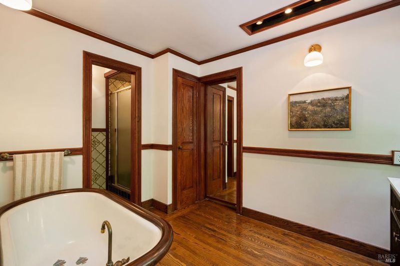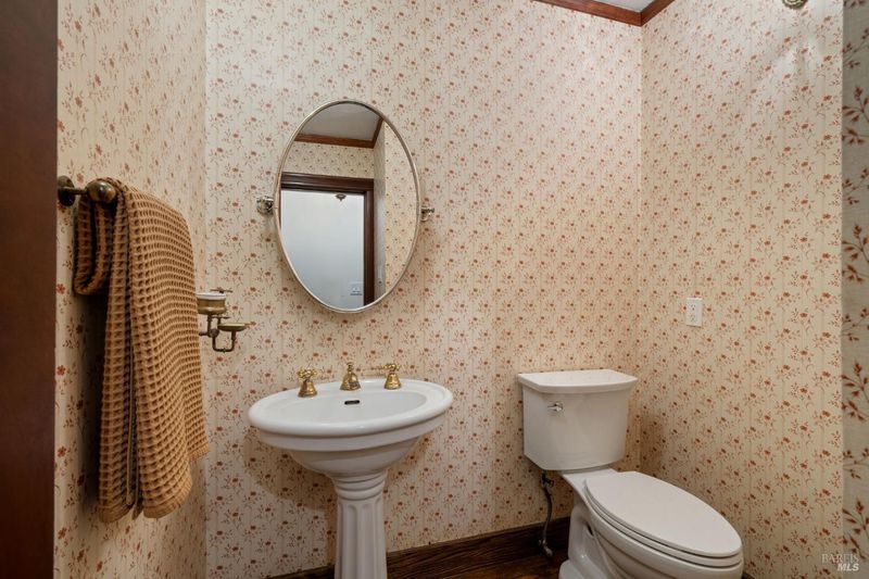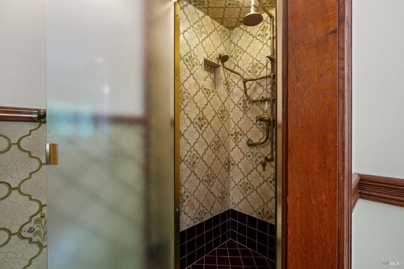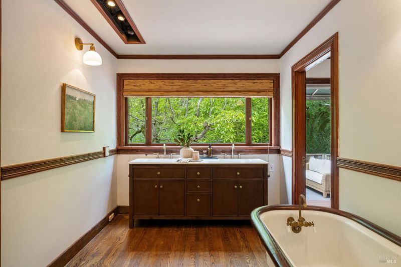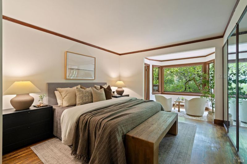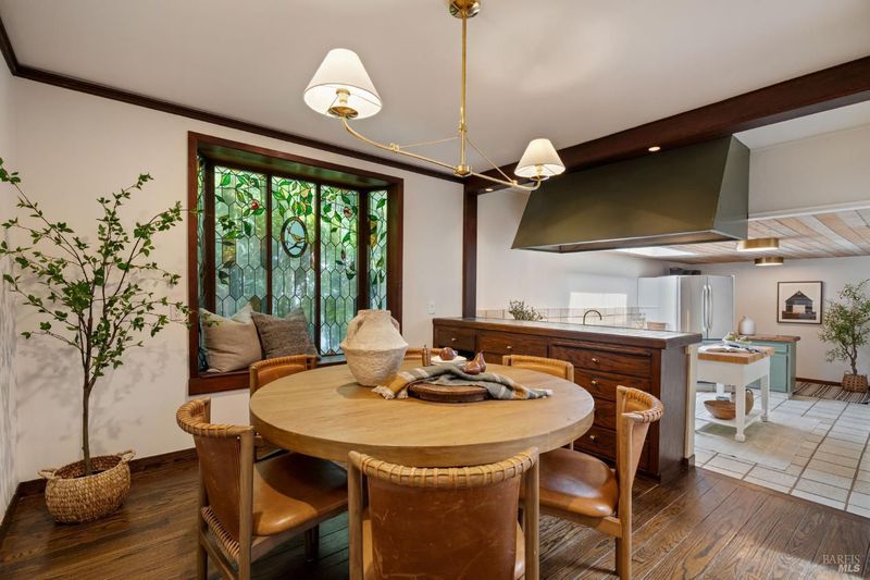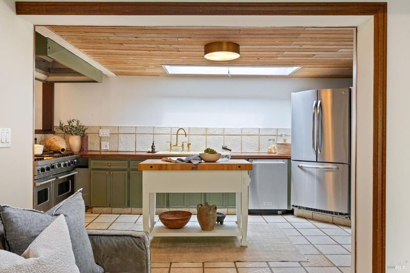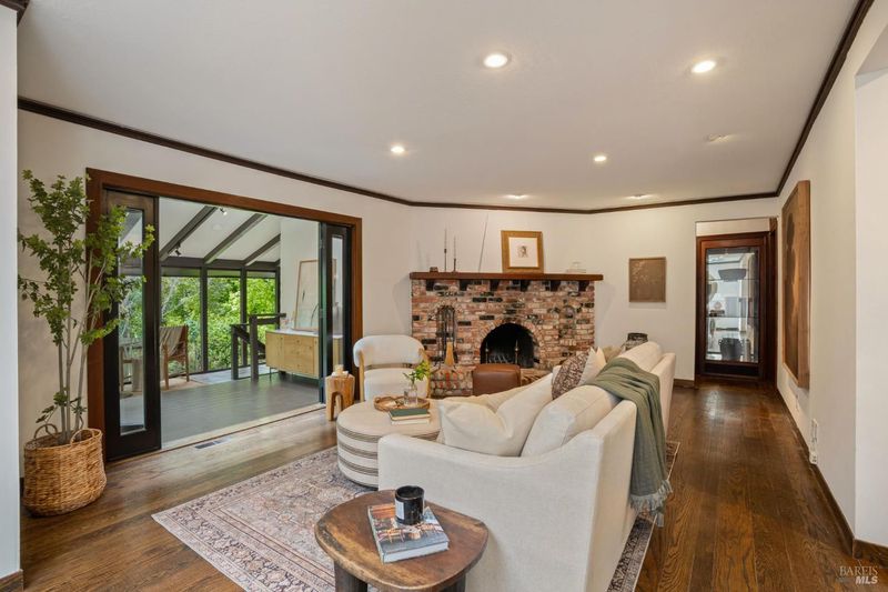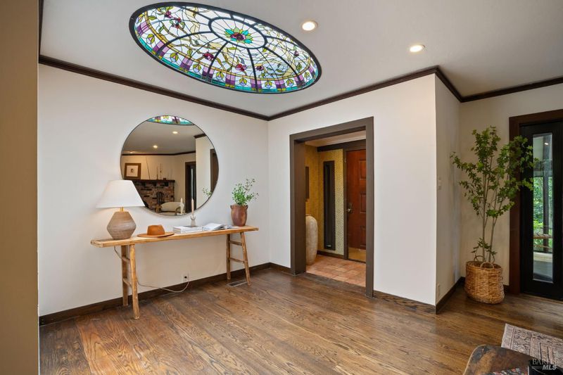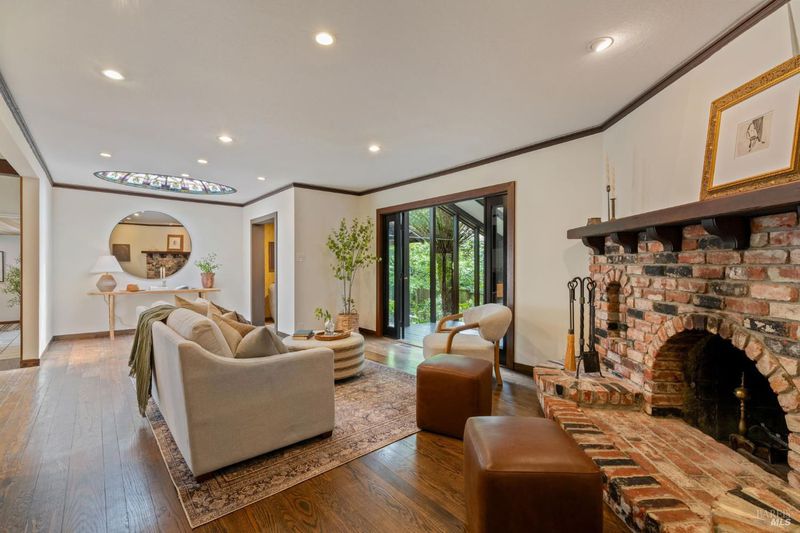 Welcome to 53 SFD, an eclectic 1949 home blending Japanese-inspired design with mid-century influences, where craftsmanship, natural materials, and a strong connection to nature define the experience. A private driveway lined with bamboo, fig, and mature trees accommodates 4-5 cars and creates a peaceful buffer from the street. Beyond a traditional Japanese-style gate, shaded by a flowering cherry tree, the home opens to a serene garden with layered plantings, stepping stones, and a zen fountain. The pathway was designed to echo falling cherry blossoms, beautifully realized each spring. Inside, the home is rich with character. Redwood paneling, stained glass windows, vintage tile work, and distinct rooms create warmth and individuality throughout. A stained-glass dome skylight crowns the entry, casting colored light across the space. The main living room is anchored by a substantial brick fireplace and flows to a glass-enclosed sunroom overlooking the gardens. The kitchen balances charm and function with butcher block countertops, and a Viking range. Nearby, a cozy family room offers a casual place to gather or entertain. A formal library could be a 3rd bedroom. It is wrapped in floor-to-ceiling wood paneling, with built-in shelving and its own fireplace, creates an intimate retreat rarely found today. Across 2,389 square feet, the layout offers flexibility with two bedrooms, an office, and two sunrooms. Below, an expansive 1,814-square-foot basement provides exceptional storage space rarely seen in Marin. The primary suite opens to a bright sitting area with picture windows oriented toward Corte Madera Creek just beyond. An adjoining glass-enclosed workspace enhances the connection to nature. The en-suite bath adds personality with cobalt blue vintage tile and rich wood paneling. The secondary bedroom sits adjacent to the library, with sliding doors opening directly to the deck. A nearby full bath continues the home's timeless style with a clawfoot tub and separate shower. Outdoor living is equally special, with a split-level deck designed for entertaining or quiet relaxation beside the creek, where deer, birds, and seasonal steelhead salmon are often seen. Positioned on the border of Ross and San Anselmo, the location offers easy access to cafs, trails around Phoenix Lake, dining, shopping, top-rated schools, and a vibrant community delivering both convenience and escape in one remarkable setting.