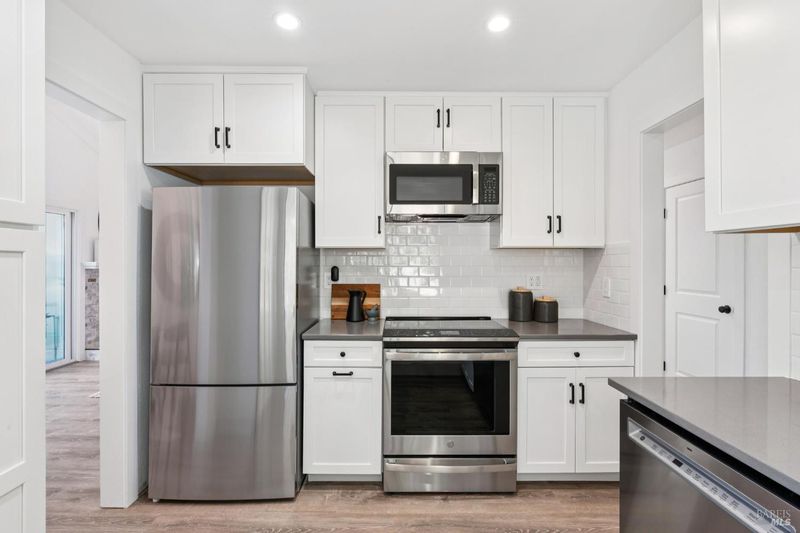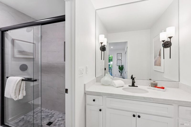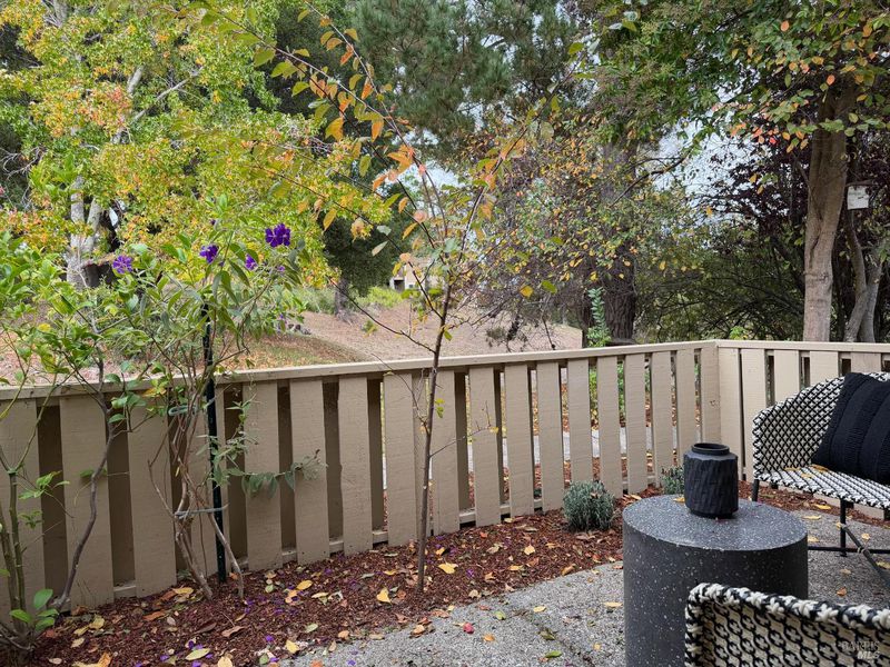 Newly remodeled single-level, semi-detached end home with views of trees and nature in coveted Shelter Ridge. The living room feels grand with a vaulted ceiling, wood-burning fireplace, and serene outlooks from both the windows and the adjoining deck - an uncommon, truly peaceful setting. The one-level layout offers easy living and a natural flow throughout. Beautifully remodeled, the home is well-updated and tastefully finished, featuring a stunning new kitchen with modern cabinetry, sleek countertops, and all-new appliances including an induction range. Both bathrooms were stylishly updated, and the primary suite enjoys its own patio and garden area. Upgrades also include new flooring, lighting, and electrical panel. A separate laundry room with brand-new washer and dryer, generous attic storage, and abundant natural light in the main living spaces and bedrooms enhance everyday comfort. Two side-by-side carport spaces are included. The well-managed community offers a newly renovated clubhouse, pool, saunas, and tennis courts. Ideally located near Hwy 101, bus lines, top-rated schools, Mill Valley Community Center, bike paths, restaurants, parks, and more.