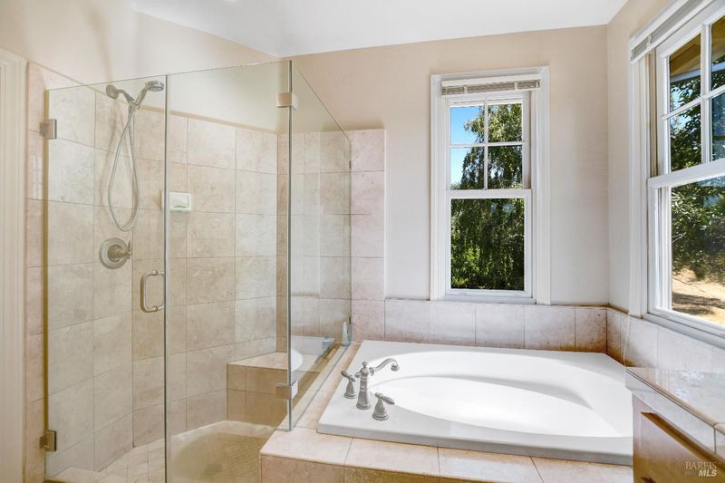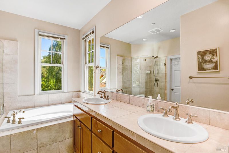 - Double Sinks, Shower Stall(s), Soaking Tub, Tile, Walk-In Closet