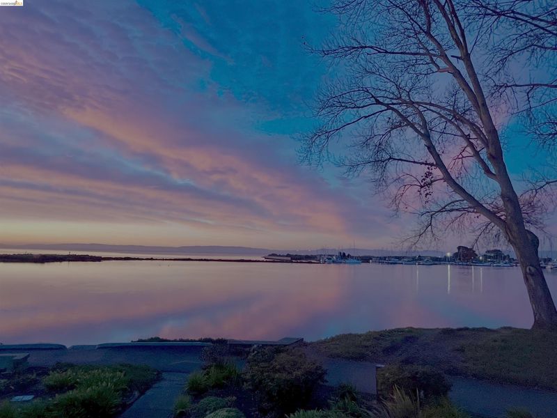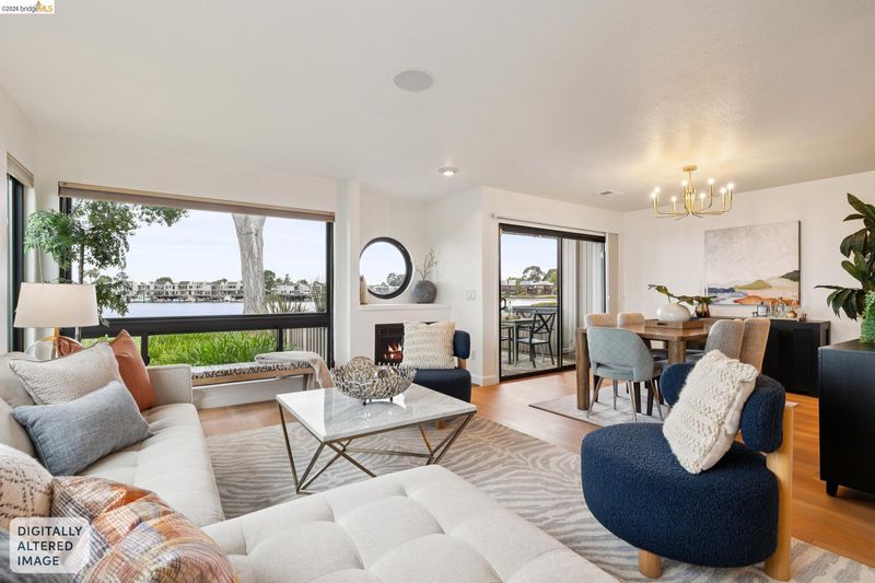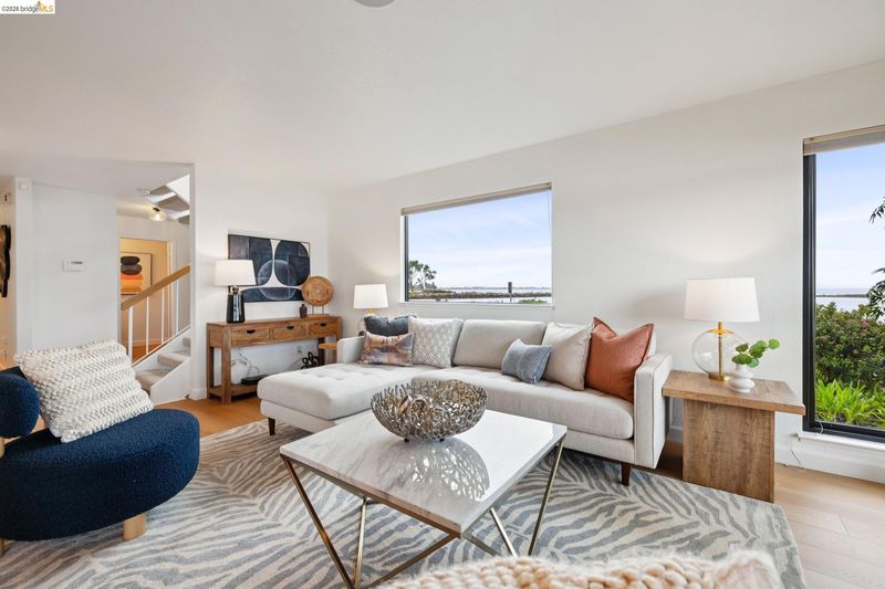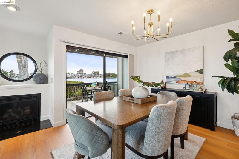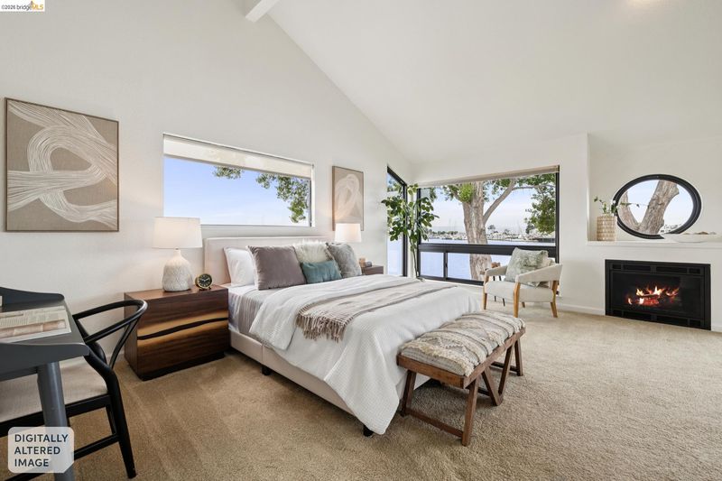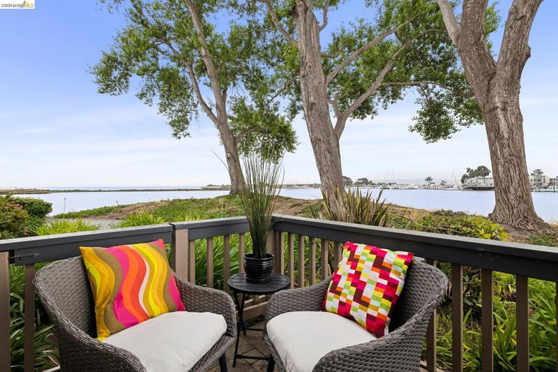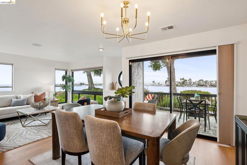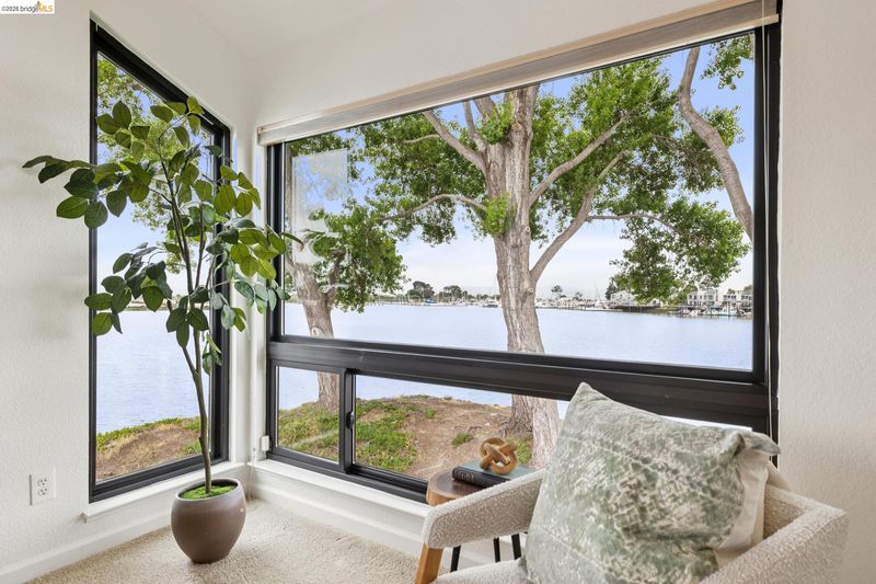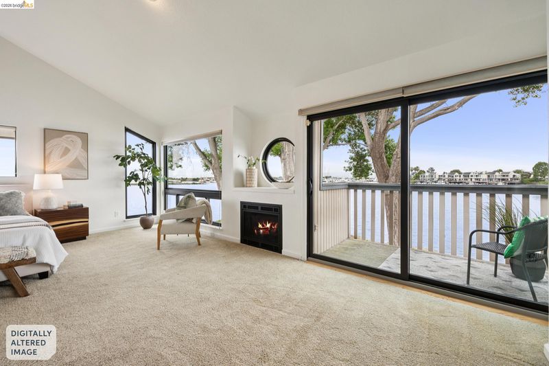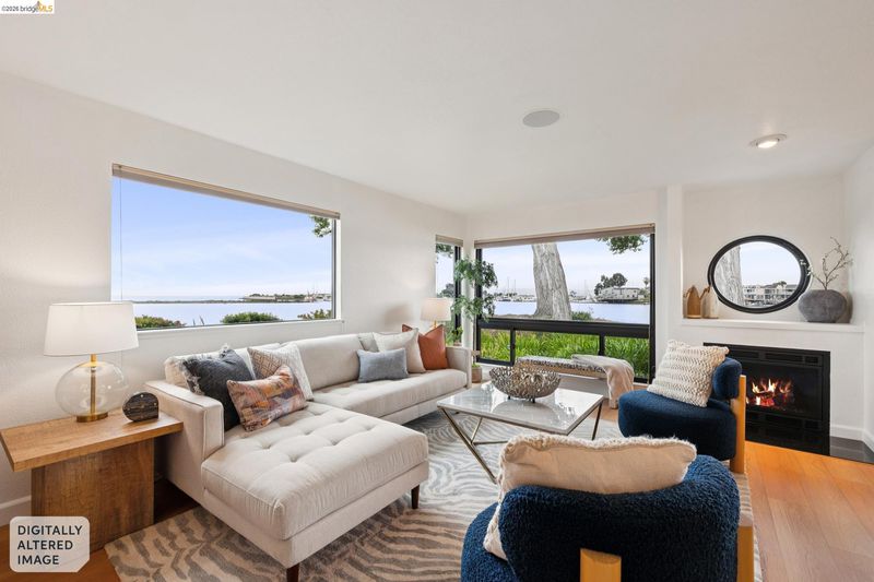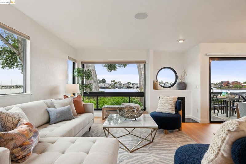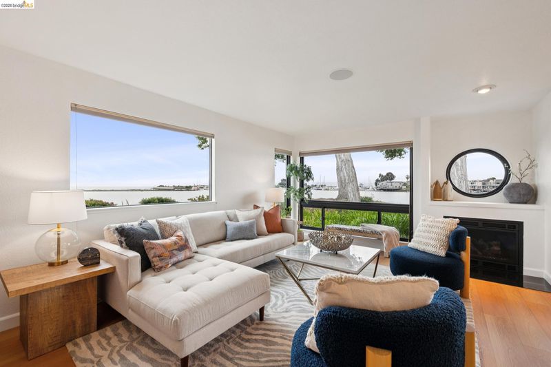 Rare 2-story condo that lives like a single-family home with sweeping views of the marina, SF Bay & Crown Memorial Beach. This light-filled residence offers a seamless floorplan designed to maximize its stunning setting. Features include newer luxury laminate flooring, updated kitchen with stone counters, solid maple cabinetry, stainless appliances, pull-out drawers & under-cabinet lighting. Effortless flow connects dining, side patio, garage & den. Two updated fireplaces add warmth & modern style. Upstairs, the primary suite is a retreat with vaulted ceilings, private view patio, plush carpet & spa-like bath with skylight, radiant heat floors, double sinks & soaking tub designed to retain heat. The updated hall bath serves additional bedrooms. One bedroom opens to a second patio with deep storage. Attached 2-car garage with laundry hookups, built-ins & loft storage. HOA covers exterior maintenance. Close to Webster St shops, restaurants, ferry & freeway access.