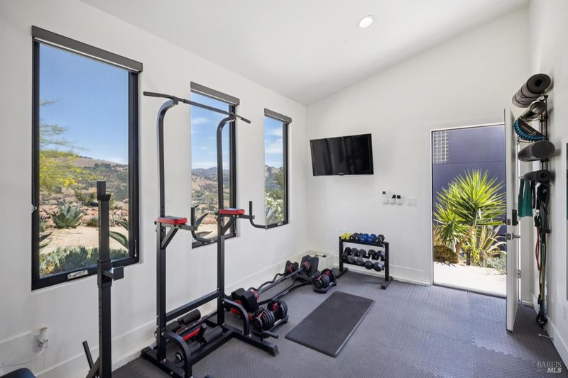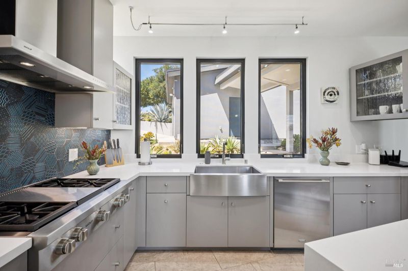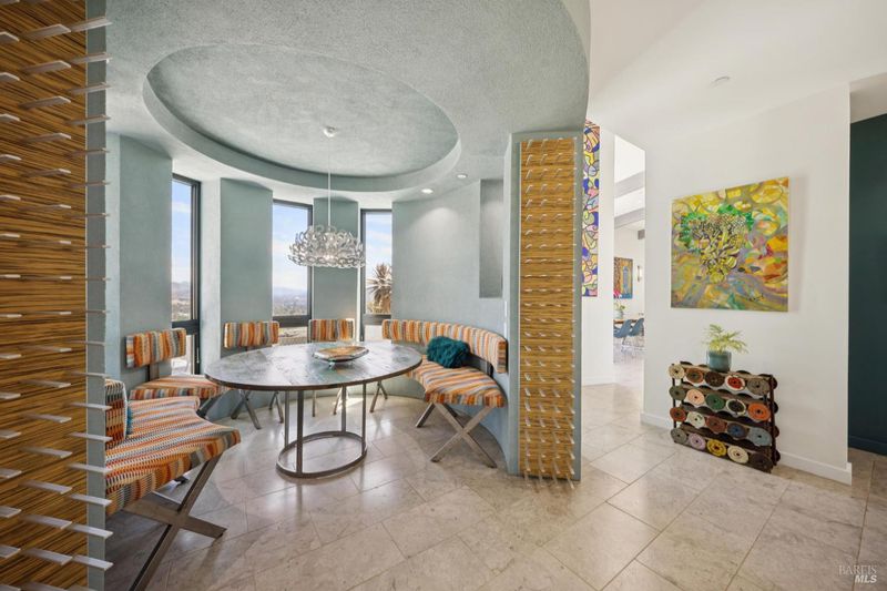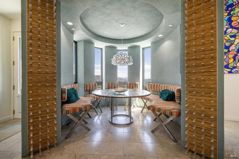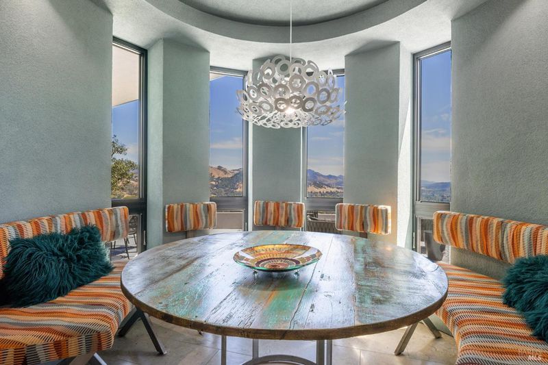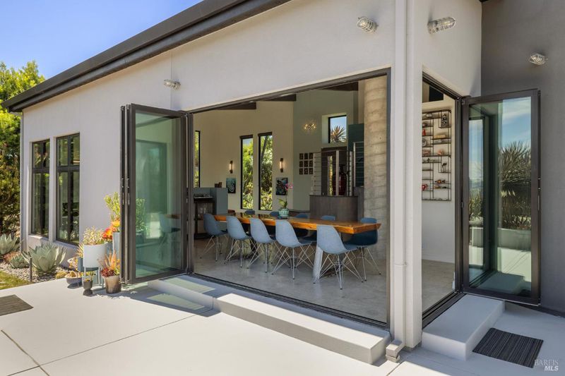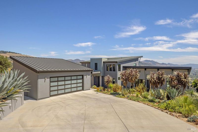 Perched atop a private knoll, Casa Salida del Sol is an architectural gem by award-winning House + House Architects. Designed to capture sunrise over the eastern mountains, the residence combines vaulted ceilings, retractable NanaWalls, and oversized windows for seamless indoor/outdoor living across six distinct entertaining areas. The light-filled interiors feature custom details and an open kitchen with Wolf, Sub-Zero, and Cove appliances. Remodeled in 2019 with limestone floors, custom windows and new kitchen, the home includes radiant heat, mini-splits, passive solar and natural cooling. Outdoors, enjoy the large patio, fire pit lounge, saltwater spa, striking succulent landscaping and gardener's workspace. Detached garage and 220 sf flex room added in 2021. City-approved plans for a 1,664 sf garage with 1,169 sf ADU included. Set on nearly an acre, it offers seclusion while minutes from Santa Rosa and Wine Country amenities. A rare offering of design, privacy, and views.