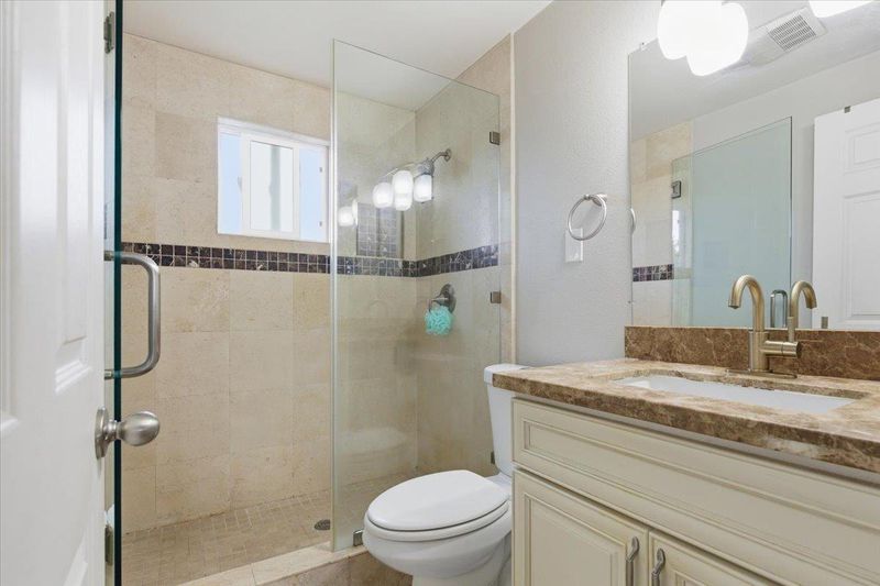 - Double Sinks, Marble, Primary - Stall Shower(s), Shower over Tub - 1, Solid Surface, Updated Bath