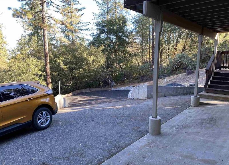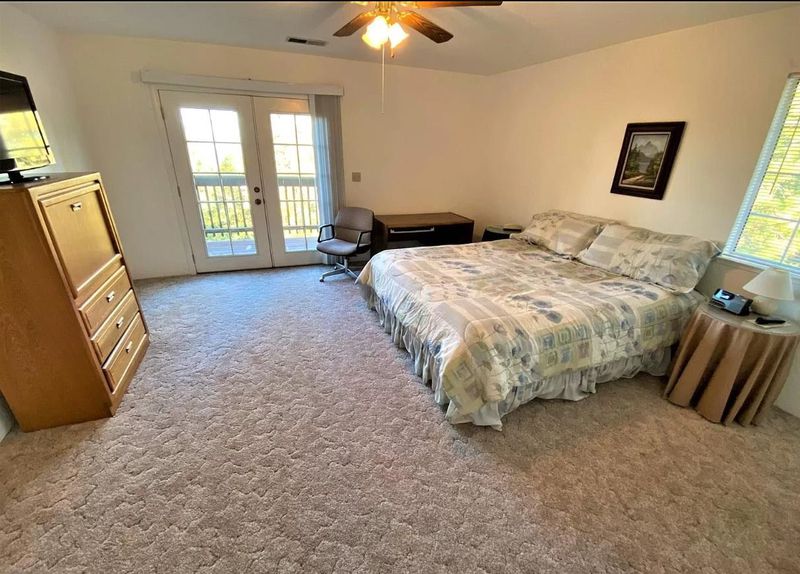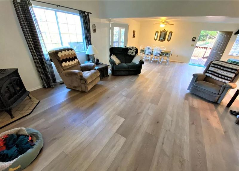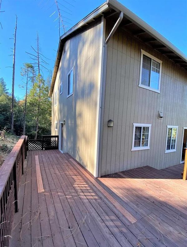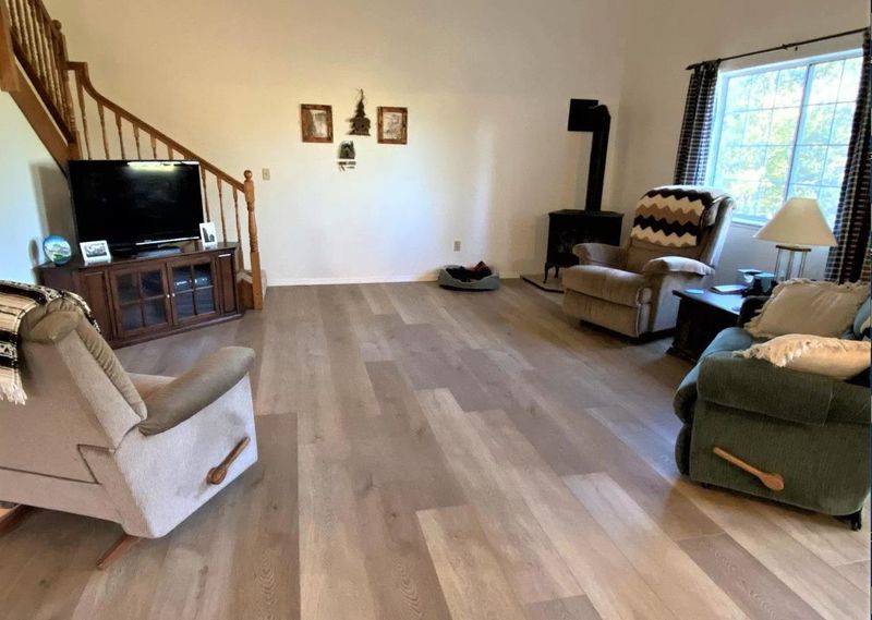 Just one mile from town, this lightly used vacation home offers beautiful mountain views with no HOA dues. The home features a dramatic two-story living room with a propane stove and French doors opening to a spacious wraparound deck—ideal for indoor-outdoor living. The floor plan includes three bedrooms and three full bathrooms, generous dining areas, and a well-appointed kitchen with abundant counter space and a breakfast bar. Adjacent to the kitchen is a separate laundry room with tile flooring and pantry cabinetry, along with an interior stairway providing convenient access to the garage. The oversized garage measures approximately 30' x 35' (over 1,000 square feet) and may accommodate up to four vehicles in tandem. Three garage walls are constructed of concrete block. The primary suite features French doors leading to a private deck, a walk-in closet, and ample natural light. Additional highlights include five ceiling fans, double-pane windows with mini and vertical blinds, new laminate and tile flooring in the great room, new gutters, newly paved driveway with retaining wall, recently pumped septic system, and insulation between each floor level for added comfort and sound control.